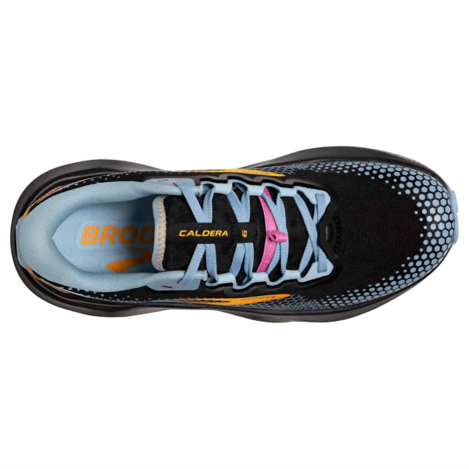 Discover enhanced comfort and stability with the WOMEN'S CALDERA 6 RUNNING SHOES by BROOKS, designed specifically for trail enthusiasts. These athletic shoes feature an all-new, quick-drying air-mesh upper for superior breathability. Benefit from the nitrogen-infused DNA LOFT v3 midsole and redesigned outsole, offering elevated cushioning and a stable platform. With a midsole drop of 6mm and weighing just 281g, these shoes provide a neutral support level ideal for those with medium to high arches tackling ultra trails. Color: Black/Blue/Yellow. Width: Medium. Toe Shape: Round.