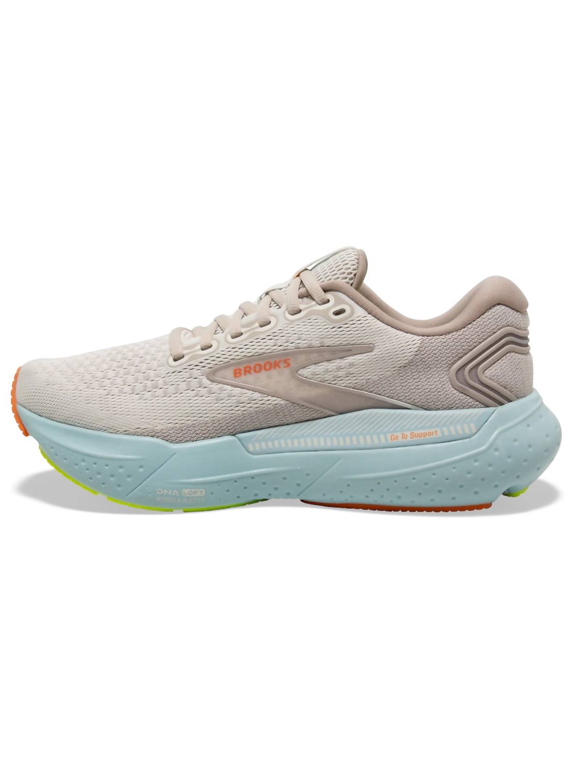 When fashion meets function. Experience ultimate comfort with the Women's Glycerin 21 Shoes by BROOKS, designed for performance in a striking Coconut/Aqua/Autumn Sunset color palette. These athletic shoes feature an almond toe shape, ensuring a stylish yet functional fit. Perfect for adult women seeking both style and support in their athletic footwear. Ideal for various athletic activities, these shoes are a must-have for any active lifestyle.