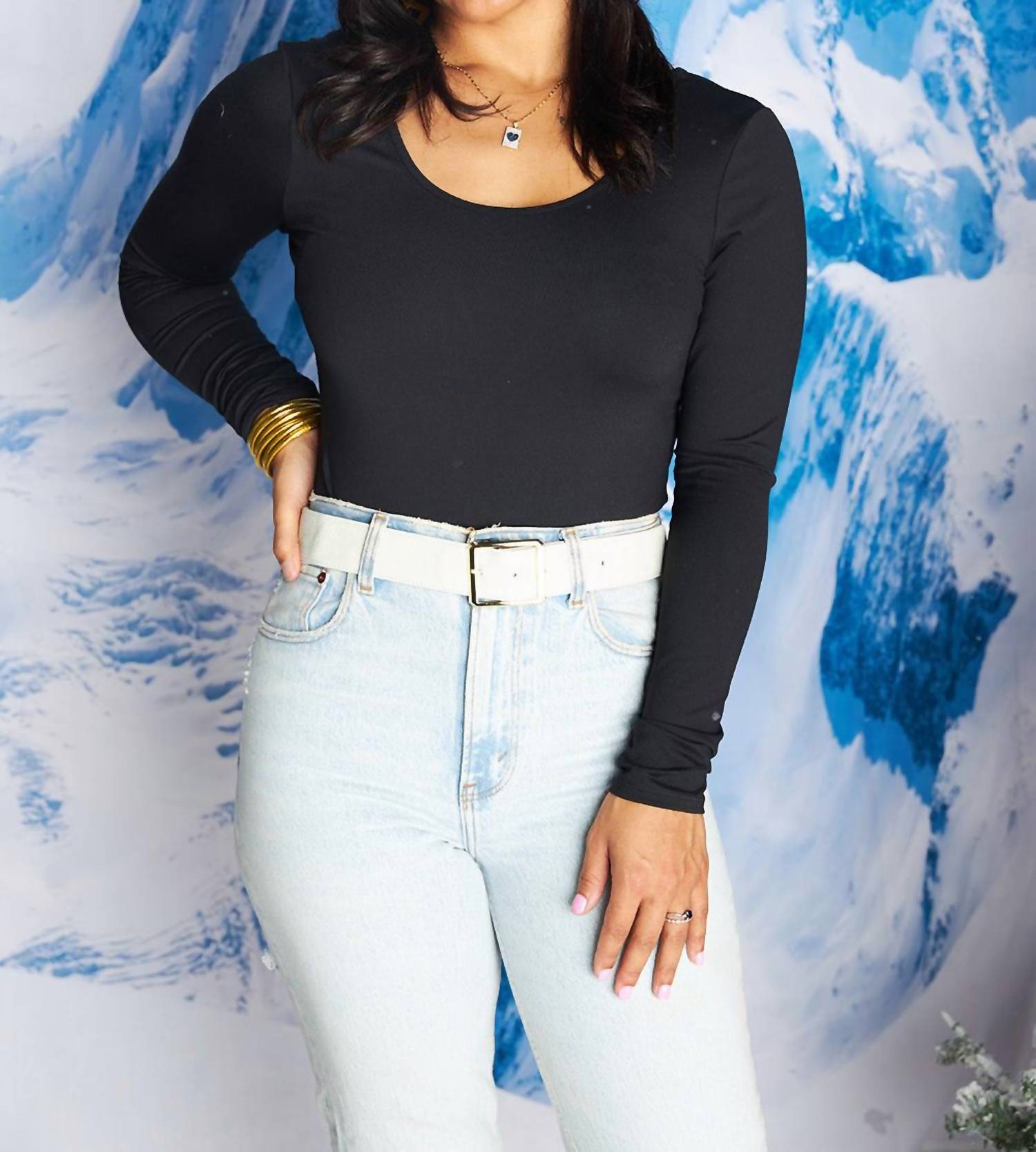 Form fitting and comfortable - this bodysuit check all of the boxes. Introducing the Benny Scoop Neck Bodysuit by BUDDYLOVE, a chic addition to your styling essentials. This bodysuit features long sleeves and a seamless, cheeky design crafted from a lightweight blend of 96% Rayon and 4% Spandex to effortlessly hug your curves. With a pull-on closure and a solid black pattern, it measures 26.5" from shoulder to hem, ensuring a flattering fit. Perfect for layering or wearing on its own, this versatile piece offers accommodating bust support and fitted waistline with a comfortable stretch.