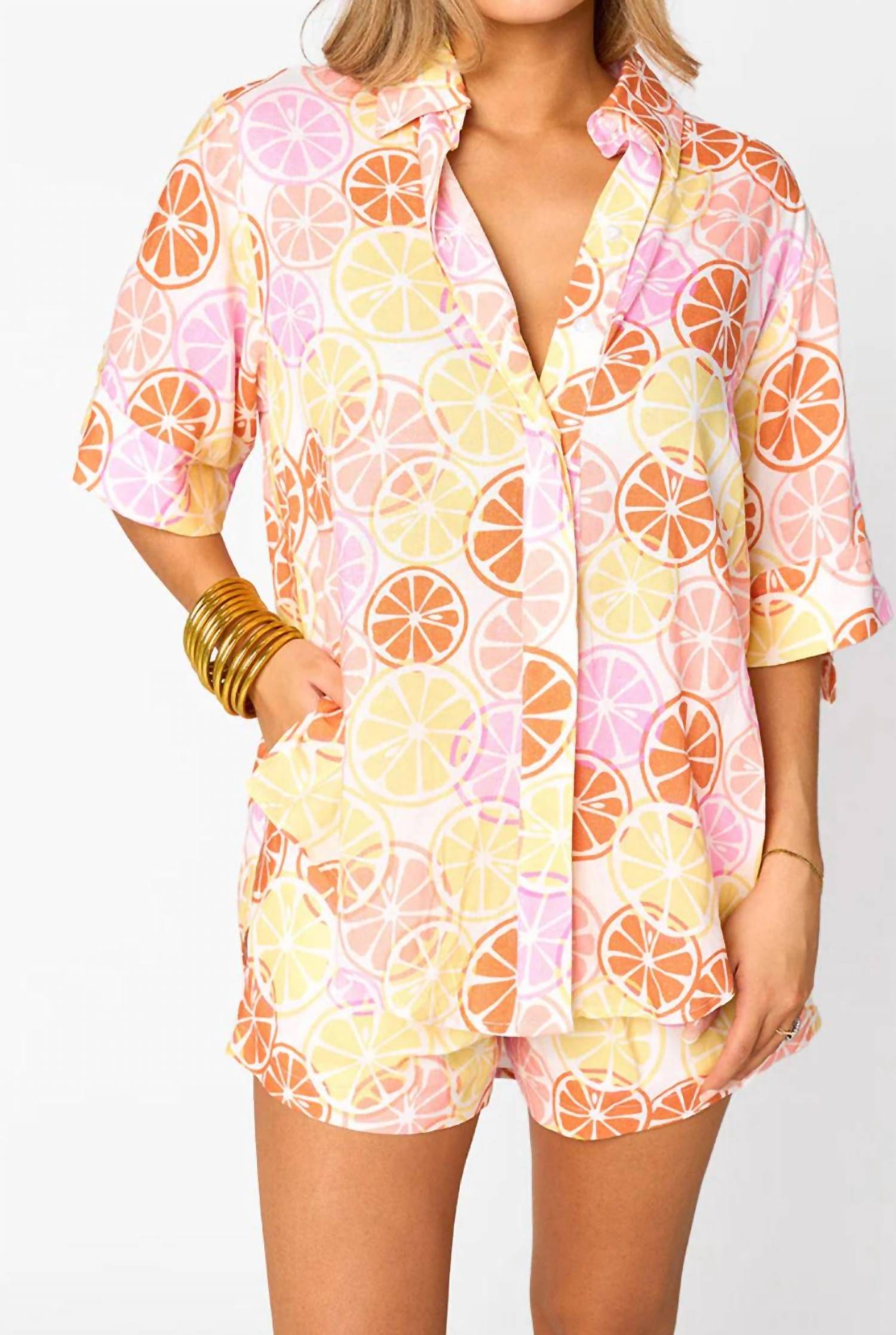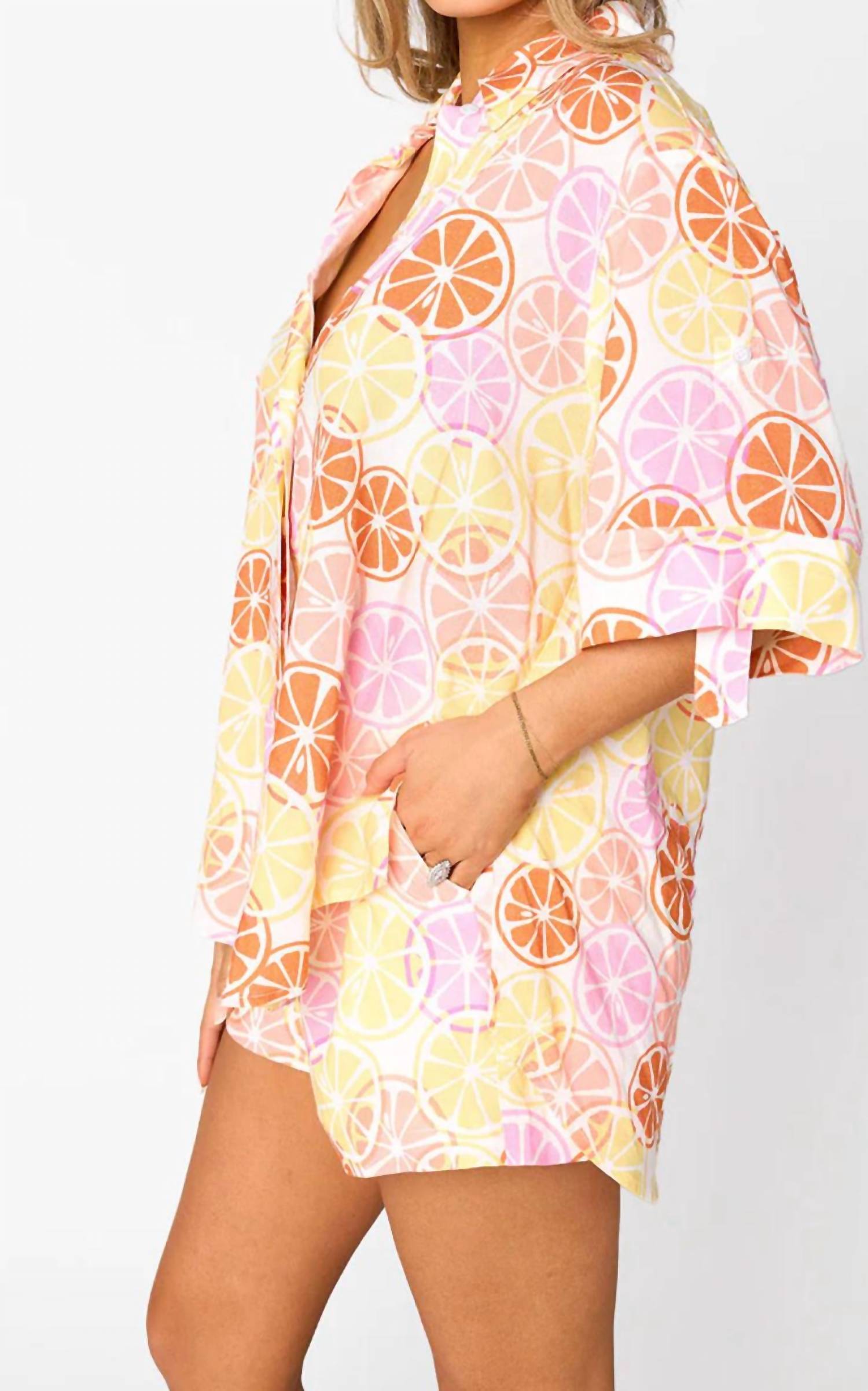 A set so cute you'll never want to take it off. Designed to look good while lounging, this little number is the perfect outfit for hanging at home in style. This women's loungewear set features a classic short-sleeve oversized shirt with a collar and functional buttons, perfectly paired with mid-thigh shorts boasting pockets and an elastic waistband for a relaxed fit. The fabric, though it offers no stretch, promises lightweight comfort, making it the ideal choice for jet-setters or a leisurely day out. The shirt’s length hits at the hips, accommodating most bust sizes, while the shorts' relaxed design ensures a comfortable fit.