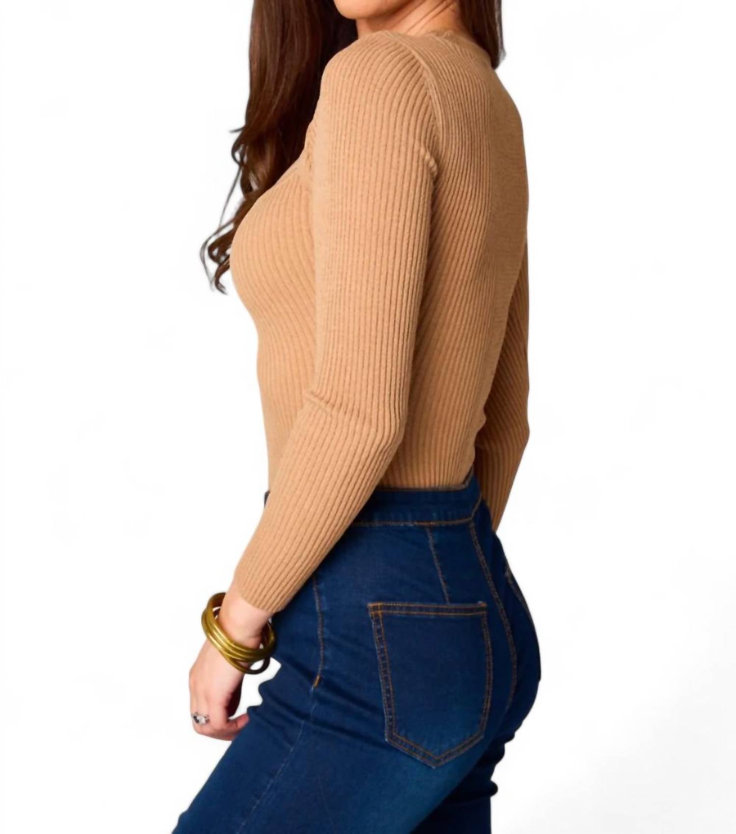 Form fitting and comfortable - this bodysuit check all of the boxes. This bodysuit is made from sweater knit fabric and features a keyhole detailed front, ribbed texture, and a cheeky bottom with snap closures at the legs. The fabric contains stretch and is composed of 50% Modwouls and 50% Acrylic. It fits true to size and is accommodating to most bust sizes, with the small size measuring 24 inches from shoulder to hem.