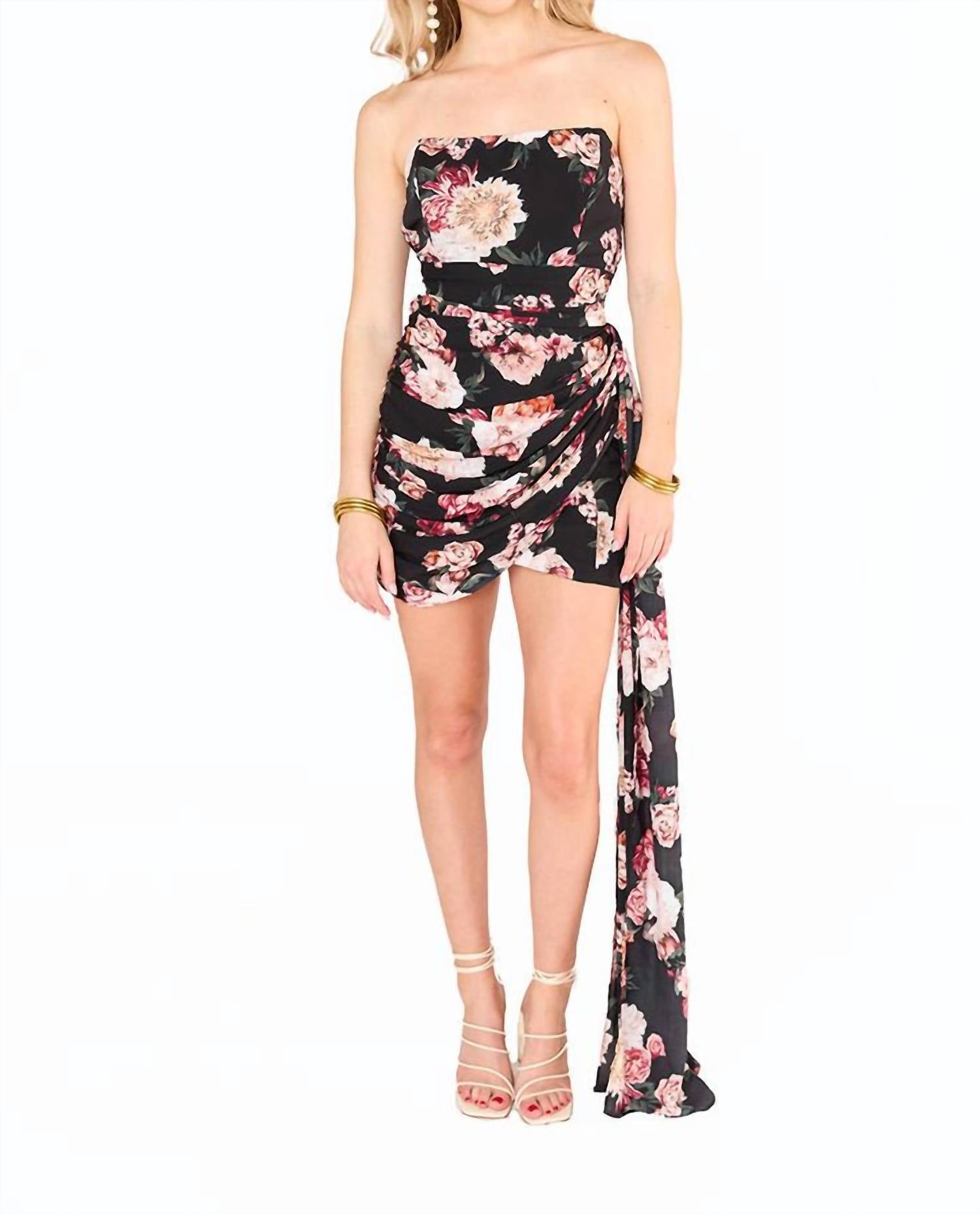 The perfect mini dress for those warmer months.Strapless, body-con Zeus Dress. Featuring an asymmetrical draped skirt. Mini length. Floral prints. Zip at the back. We recommend sizing up in the Zeus Dress. The Small measures to be 27.5" from neckline to hem. Fabric contains no stretch. 100% Polyester. Product measurements: Bust: XS-26", S-28", M-30", L-32", XL-34"; Waist: XS-26", S-28", M-30", L-32", XL-34"; Length: XS-27.12", S-27.5", M-27.88", L-28.25", XL-28.62".