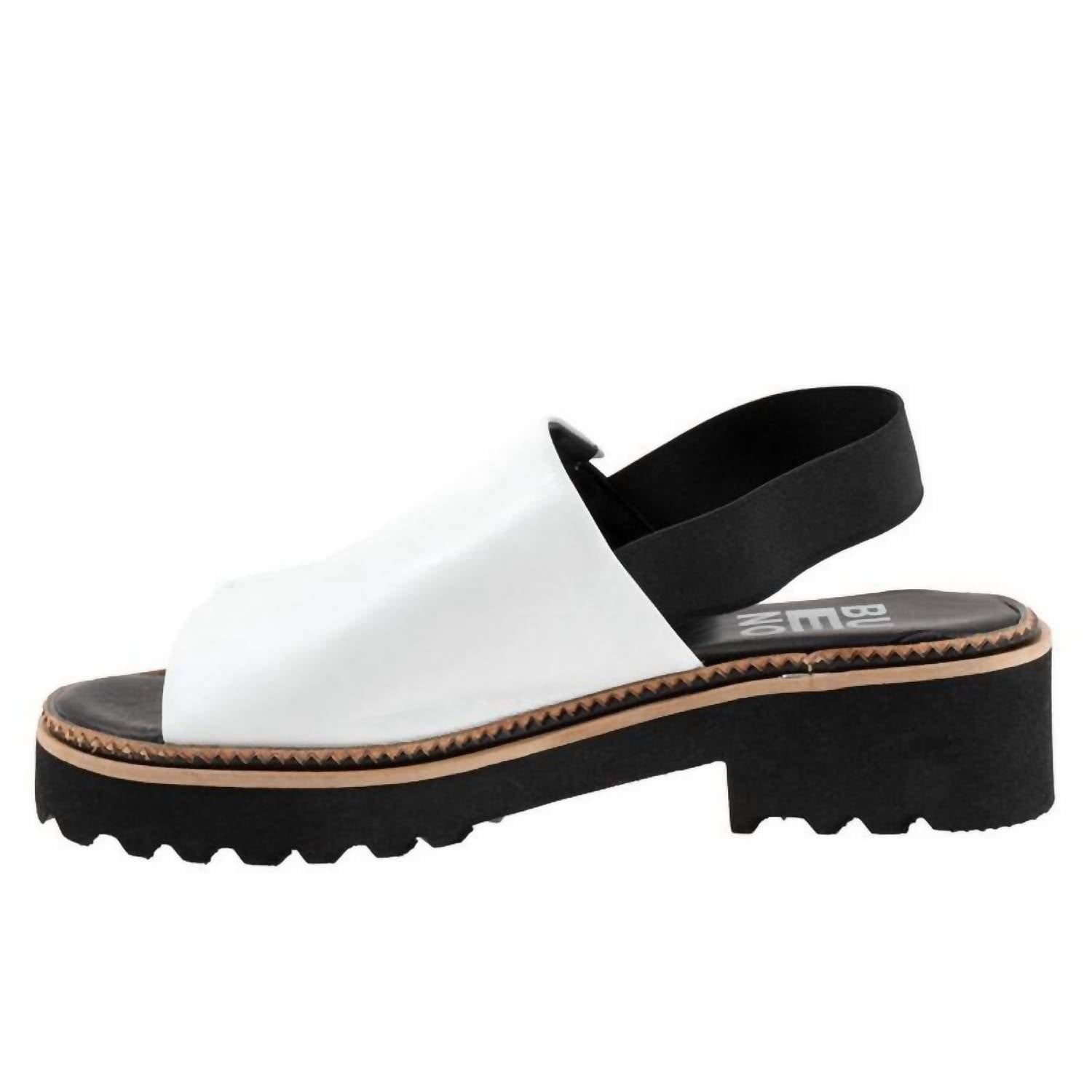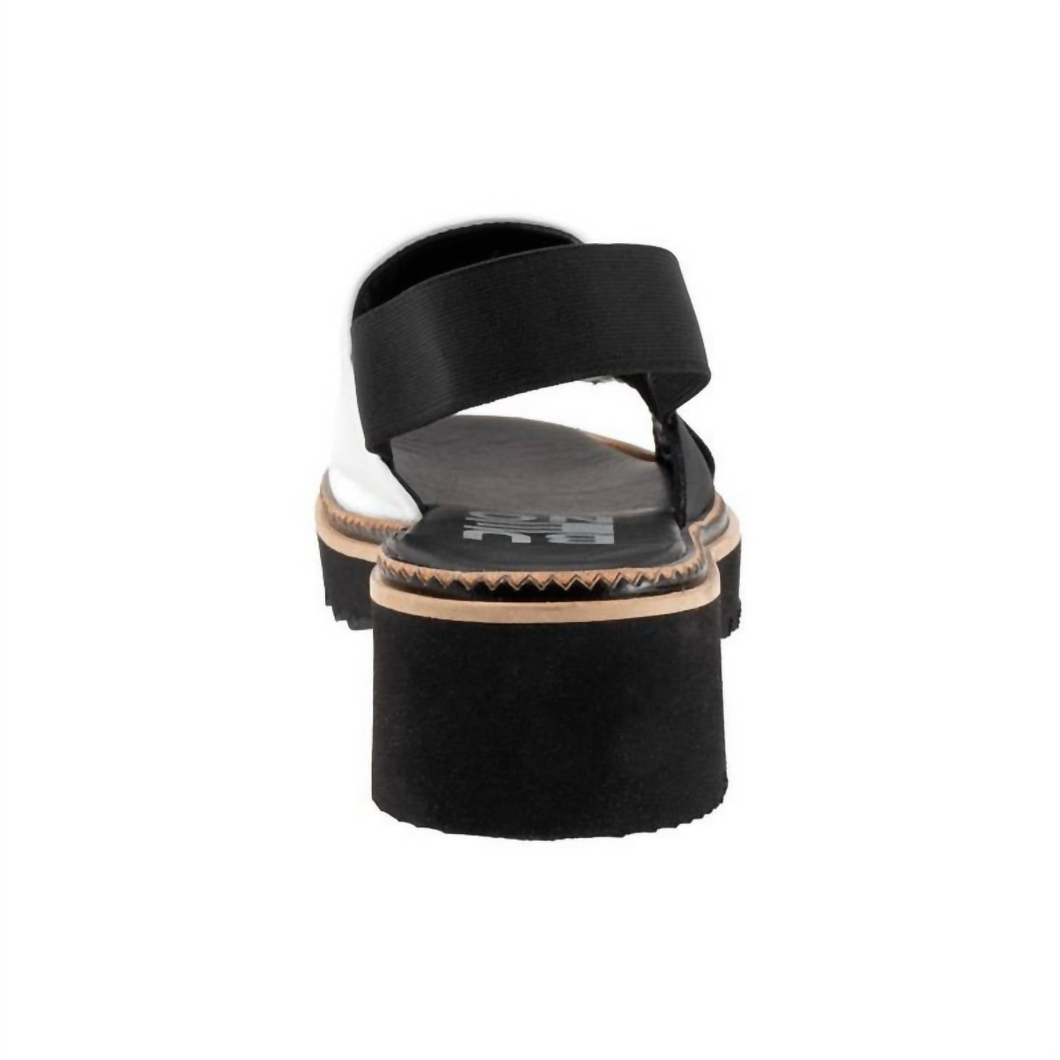Flowy dresses, cropped pants, and even jumpsuits... this sandal works with them all! Step into comfort and style with the Women's Amy Sandal by Bueno in classic white. This sandal boasts a leather lined footbed and a leather and man-made upper for premium feel and durability. Its standout features include a 1 3/4" chunky heel and elastic goring for easy wear, coupled with a synthetic rubberized sole for reliable traction. Whether you're dressing up or down, enjoy the round toe design and hallmark artisanship that make it a versatile addition to any wardrobe.