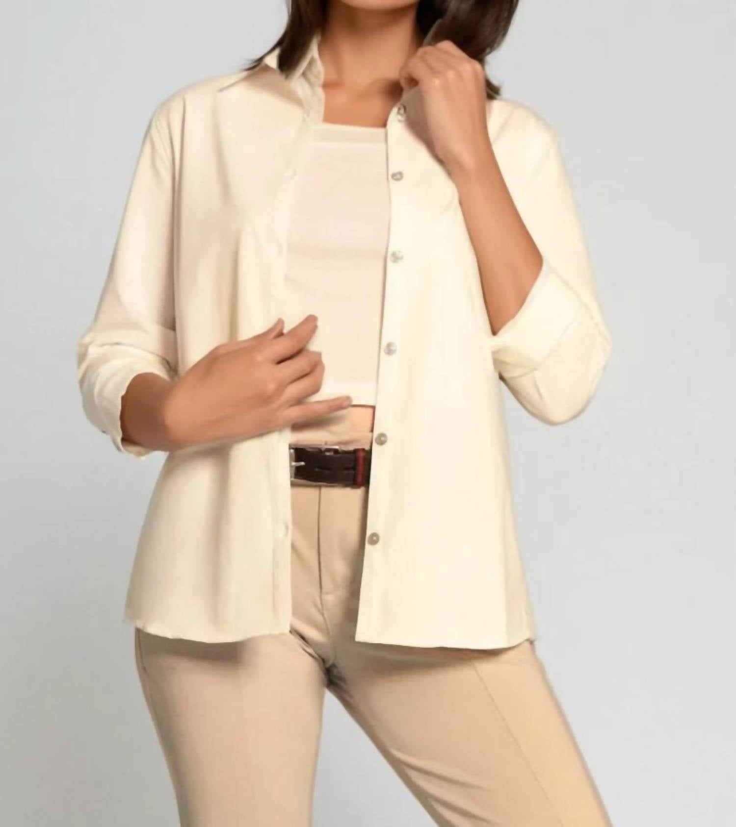 Introducing the Cinqo Single Shot Shirt by Buki, a luxury women's button-down crafted in a versatile white shade. This long sleeve shirt is constructed from a sophisticated cotton blend, featuring 60% Supima Cotton, 35% Polyester, and 5% Lycra, offering four-way stretch for maximum comfort and movement. The shirt is tailored to provide an elegant appearance with a collar neckline and button closure. Effortlessly maintain its brilliance even after 50 washes, as it boasts engineered moisture management and wrinkle resistance. Ideal for spring workwear or travel, care for it by machine washing when needed.