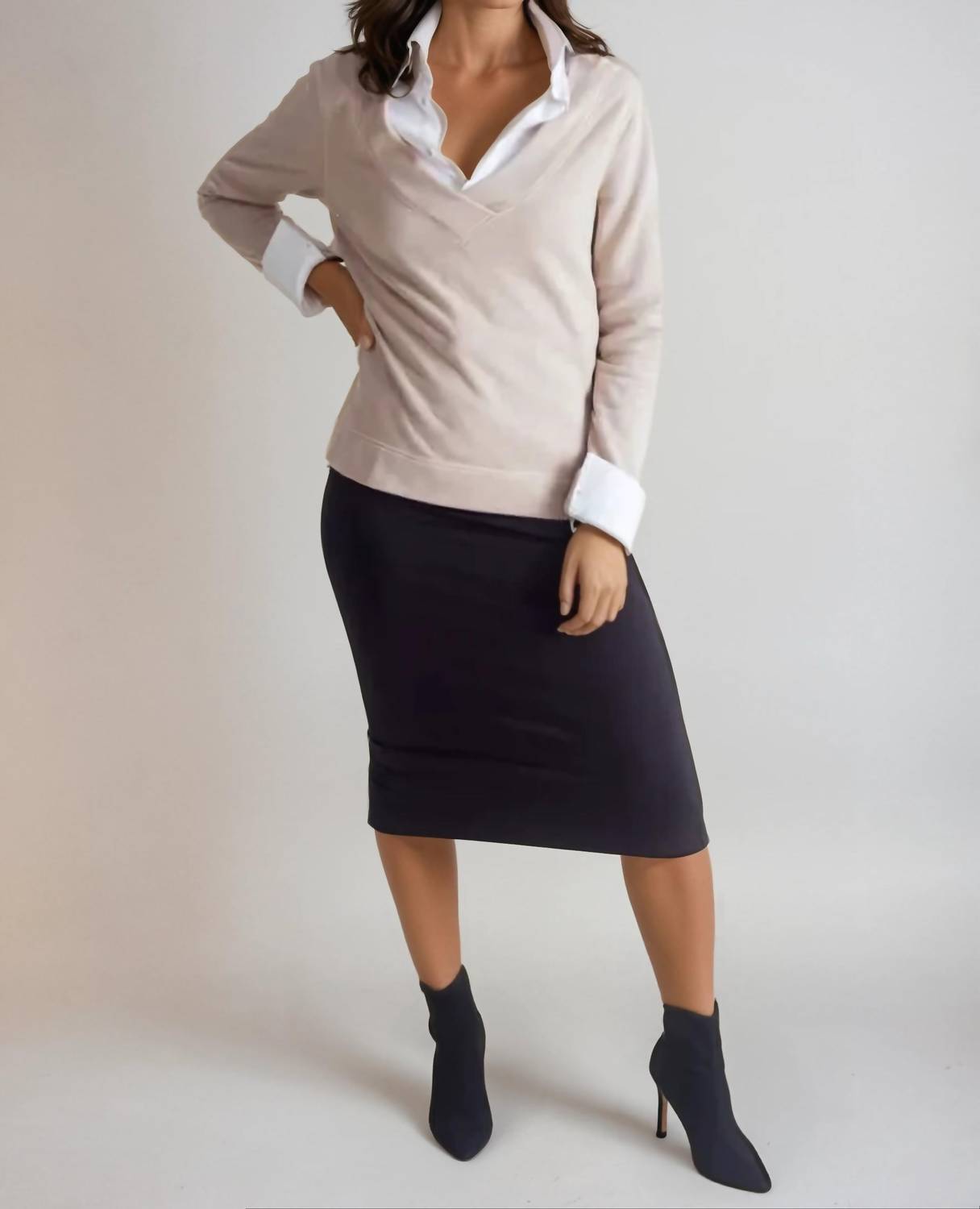 A timeless v-neck sweater that works season after season. Introducing the Power Vee 'Sweater' Sweatshirt by Buki, a pinnacle of sophistication and comfort in a versatile Camel hue. This V-neck garment features long sleeves and a split side hem, crafted from Buki's three-layer performance fabric that offers thermo-regulation, moisture management, and wrinkle resistance. Designed for women's wardrobes, this textured style fits seamlessly whether layered or worn solo. Celebrate innovation in fashion with a piece that provides warmth without the bulk, making it ideal for any occasion.
