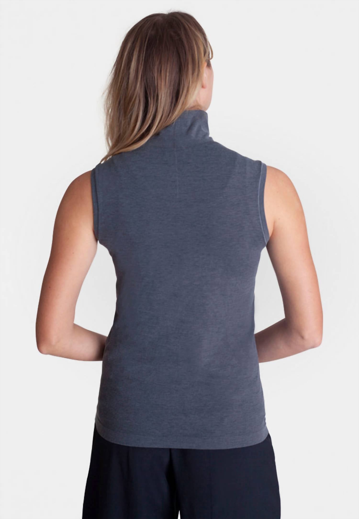 Pair this with your favorite jeans and slides for your next girls night out. Presenting the Sleeveless Turtleneck Shirt by Buki, a versatile piece in Midnight Navy, perfect for transitioning from desk to dinner. This sleek stretch-knit seamless turtleneck is crafted with 40% cotton and 60% polyester, offering a flawless base layer to wear beneath blazers and jackets or on its own for sharp elegance. Country of origin is not specified, but the top features engineered moisture management to keep you comfortable and dry, and boasts wrinkle-resistant and four-way stretch capabilities, ensuring a refined look without the need for ironing. Model is wearing a size small and stands 5'8".