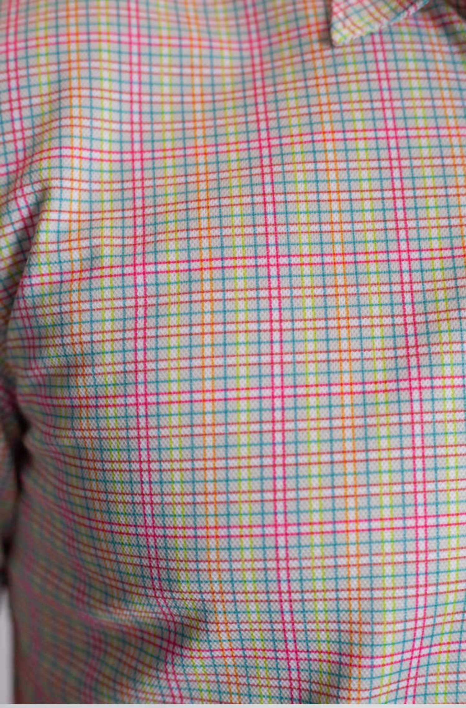 Elevate your wardrobe with the Buki Spectrum Check Short Sleeve Tech Shirt, expertly crafted for men seeking both style and comfort. This short-sleeve shirt offers a colorful floral print and a stylish two-piece, button-down collar perfect for an untucked look. Composition: Buki Core Tech fabric with engineered moisture management and wrinkle-resistant features. Closure type: Button closure. Care instructions: Machine wash. Ideal for church outings or Father's Day celebrations, this shirt seamlessly transitions from weekend casual to workday sharp. Model is 6'1" wearing a large.