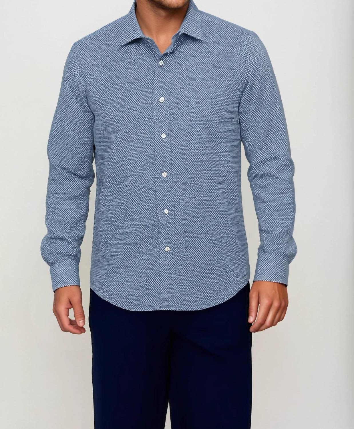 Introducing the Studio Dot Long Sleeve Tech Shirt by Buki, a masterpiece of innovation and style in a sophisticated blue hue. This men's long sleeve shirt is crafted from advanced, four-way stretch fabric that is wrinkle-resistant, moisture-wicking, and equipped with cooling yarn, providing unparalleled comfort and breathability. Featuring a clean, untucked silhouette and a smart two-piece collar with a hidden button-down design, this shirt redefines evening casualwear. Closure type: Button closure. Care Instructions: Machine wash. Ideal for a minimalist trend, designed for an evening event and perfect for gifting on Father's Day.