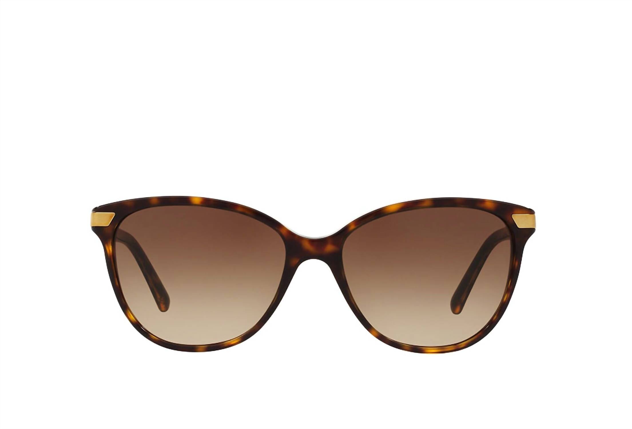 Upgrade your eyewear collection with these stunning sunglasses, meticulously designed to offer a perfect balance of style and functionality. Protect your eyes in style! Indulge in the sophistication of Burberry's BE4216 Cat Eye Non Polarized Sunglasses, designed to elevate your style with a touch of elegance. Made from durable metal, these full-rim sunglasses are available in a captivating Dark Havana with Gradient Brown lenses. The lenses have a width of 57 mm, complemented by a 16 mm bridge and a comfortable 140 mm temple length. Discover flawless craftsmanship in this chic accessory that seamlessly combines fashion-forward design with ultimate wearability.
