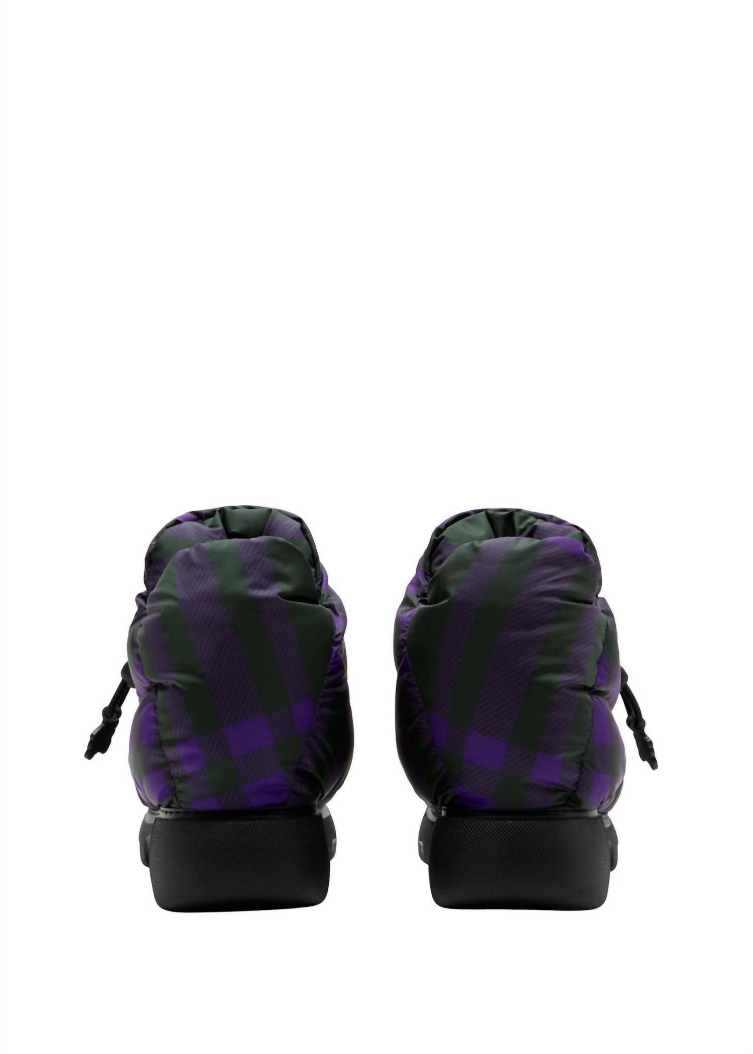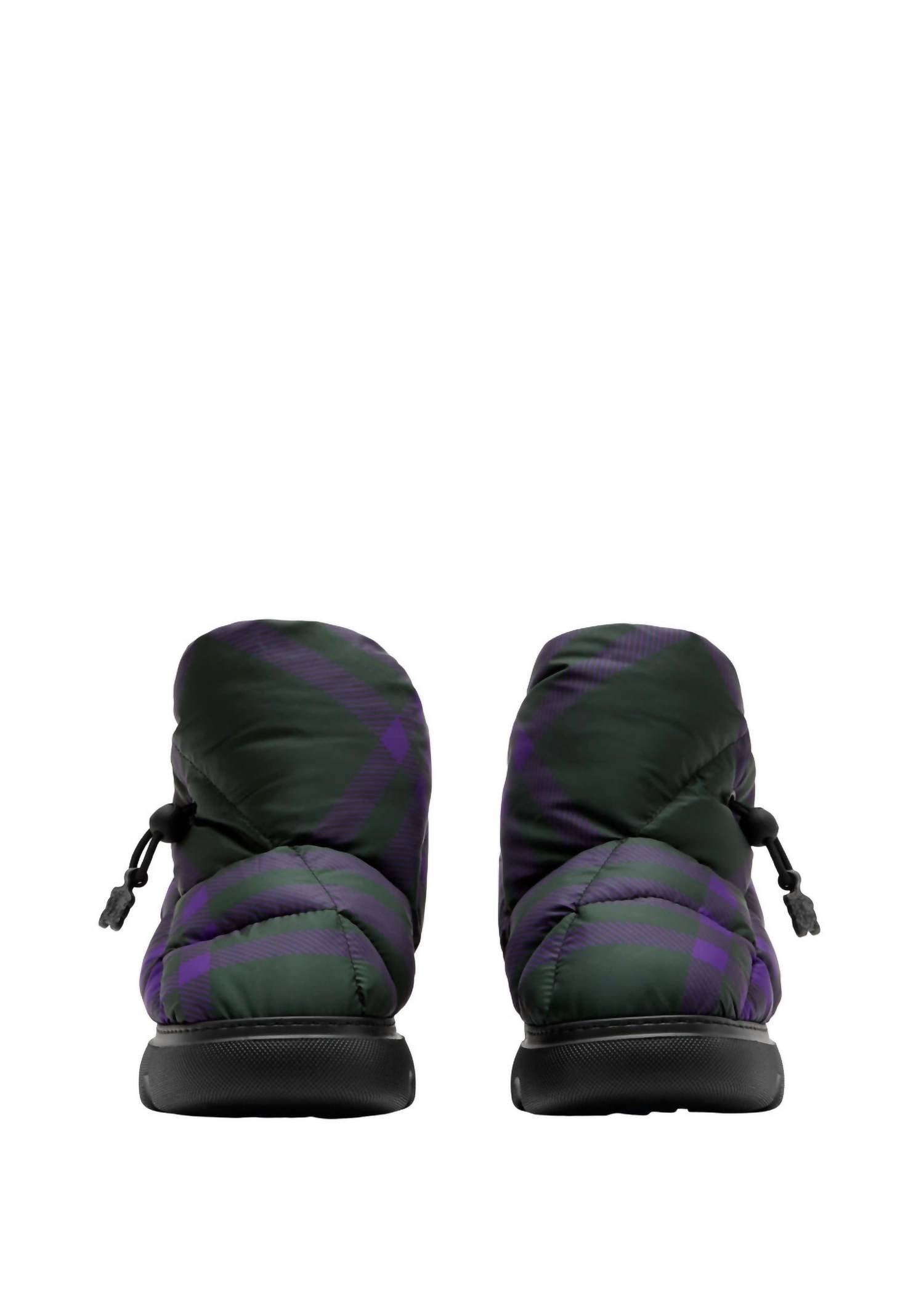 Step up your footwear game with the Men's Check Pillow Boots by Burberry, a perfect blend of comfort and style. Expertly crafted in Italy, these boots boast a quilted check pattern with a round toe and are composed primarily of 100% polyester. The padded design incorporates chunky rubber soles featuring the archive Burberry lettering and drawcord closure adorned with Equestrian Knight Design tags. Materials include a combination of polyester, polyamide, cotton, and elastane for the lining, offering a durable and luxurious feel.
