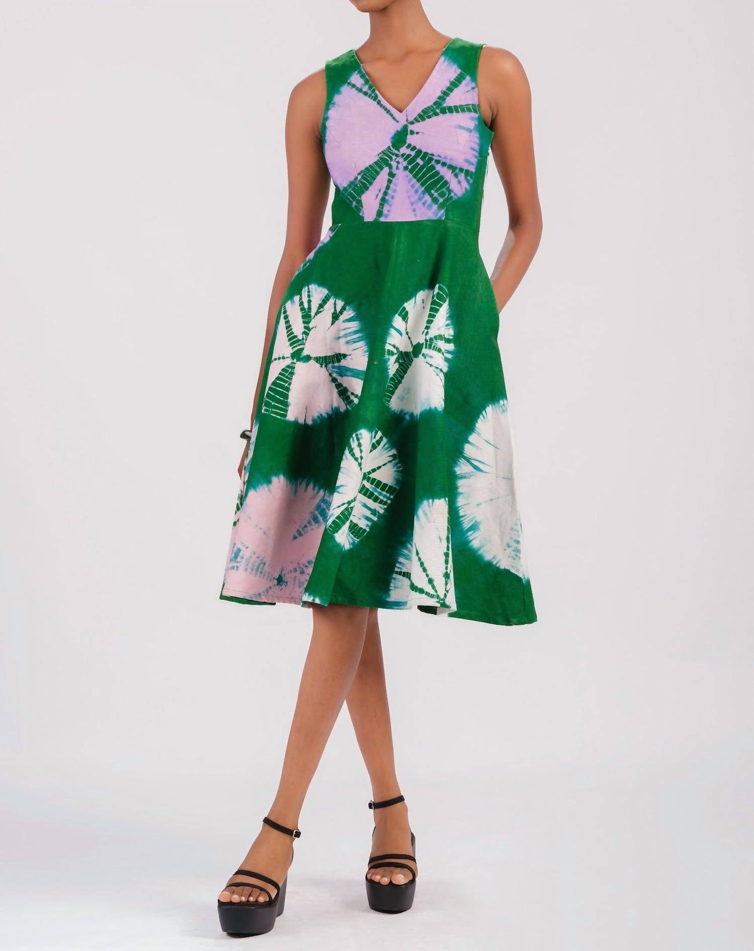 The perfect length dress does exist. Introducing the Belu Dress by Busayo, a handcrafted masterpiece in vibrant Green Multi tie-dye. This sleeveless, midi-length dress features a flattering V-neck and practical side on-seam pockets, making it a summer wardrobe essential. Composed of 100% cotton and measuring about 44 inches from shoulder to hem, it is designed with a convenient back zip closure. For care, this imported dress requires dry cleaning to maintain its exquisite charm. Model's height: 5'10".