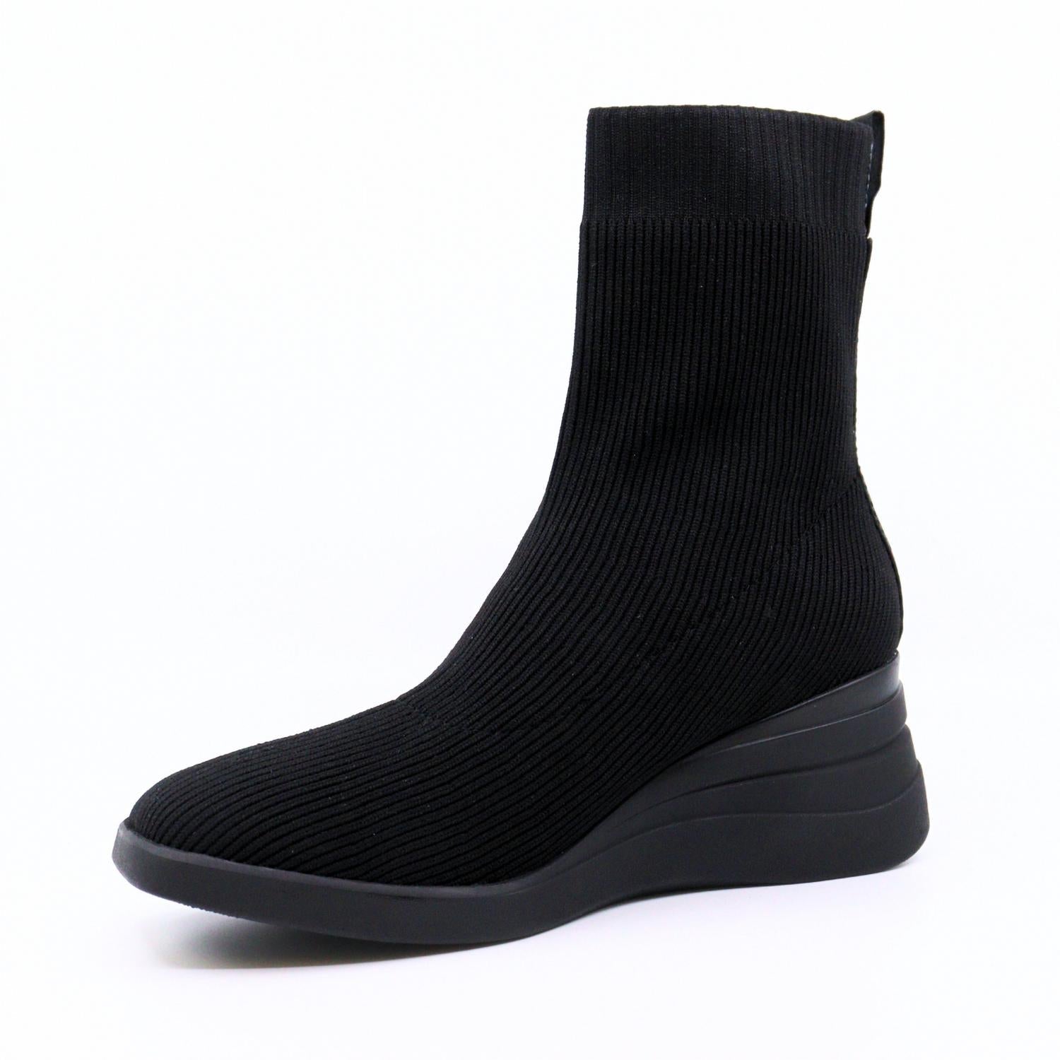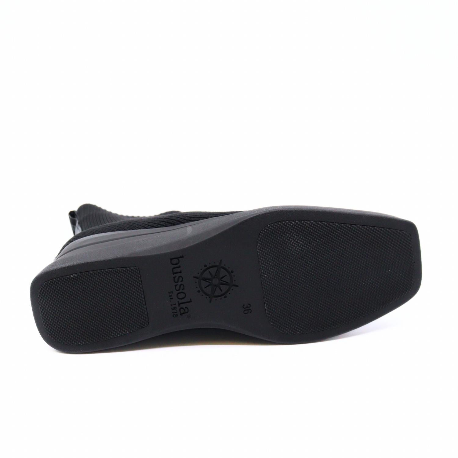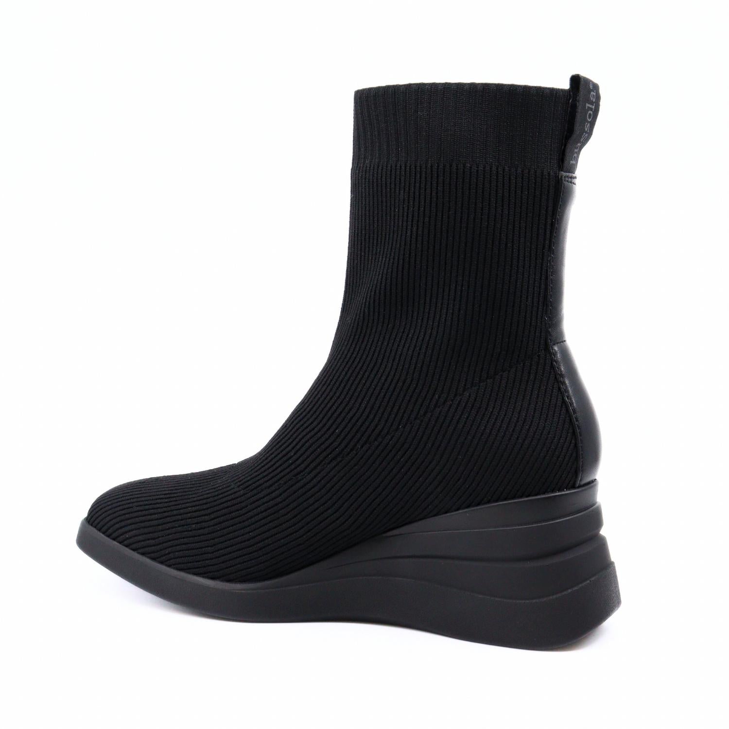 Say hello to the perfect, most versatile boot. The ankle height makes this style easily transition from day to night. Wear them with your favorite skinny jeans and tee for a more laid back look, or pair them with your favorite mini dress and jacket for a night out on the town. Experience the perfect blend of style and comfort with the Sophie Nero Knit Boots by Bussola, ideal for any occasion from coffee runs to cocktail hour. These sleek, black wedge ankle boots are crafted with ribbed knit fabric that fits like your favorite leggings, offering a snug and stylish squared toe design. With a mid-heel height of 2.36 inches, these boots provide a subtle lift without compromising stability. Featuring an anti-bacterial shield, moisture-wicking fabric, and a high-quality insole for comfort and impact absorption, the easy slip-on design with a convenient pull tab is crafted for effortless wear. Measurements: Shaft Height: 6.30 inches, Heel Height: 2.36 inches, Platform Height: 0.71 inches.