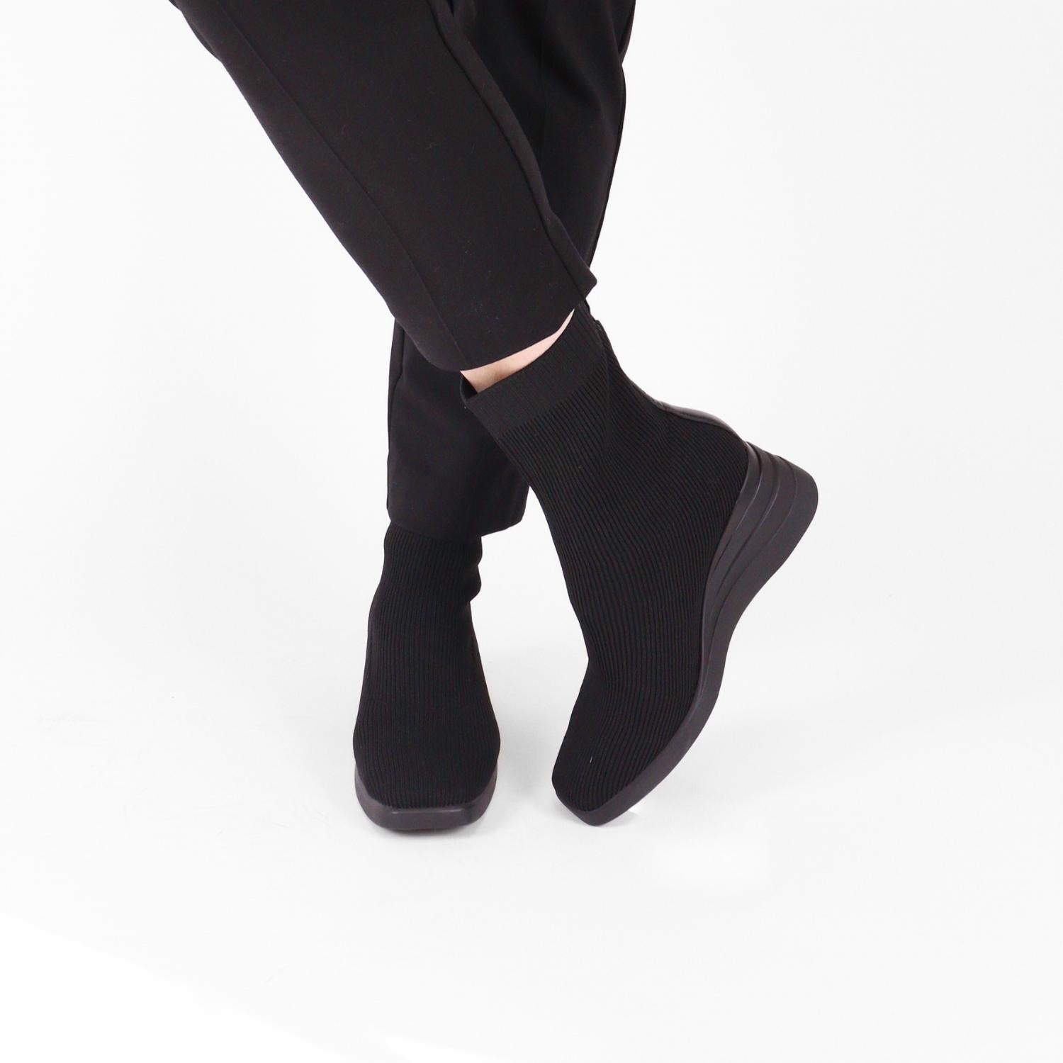 Experience the perfect blend of style and comfort with the Sophie Nero Knit Boots by Bussola, ideal for any occasion from coffee runs to cocktail hour. These sleek, black wedge ankle boots are crafted with ribbed knit fabric that fits like your favorite leggings, offering a snug and stylish squared toe design. With a mid-heel height of 2.36 inches, these boots provide a subtle lift without compromising stability. Featuring an anti-bacterial shield, moisture-wicking fabric, and a high-quality insole for comfort and impact absorption, the easy slip-on design with a convenient pull tab is crafted for effortless wear. Measurements: Shaft Height: 6.30 inches, Heel Height: 2.36 inches, Platform Height: 0.71 inches.