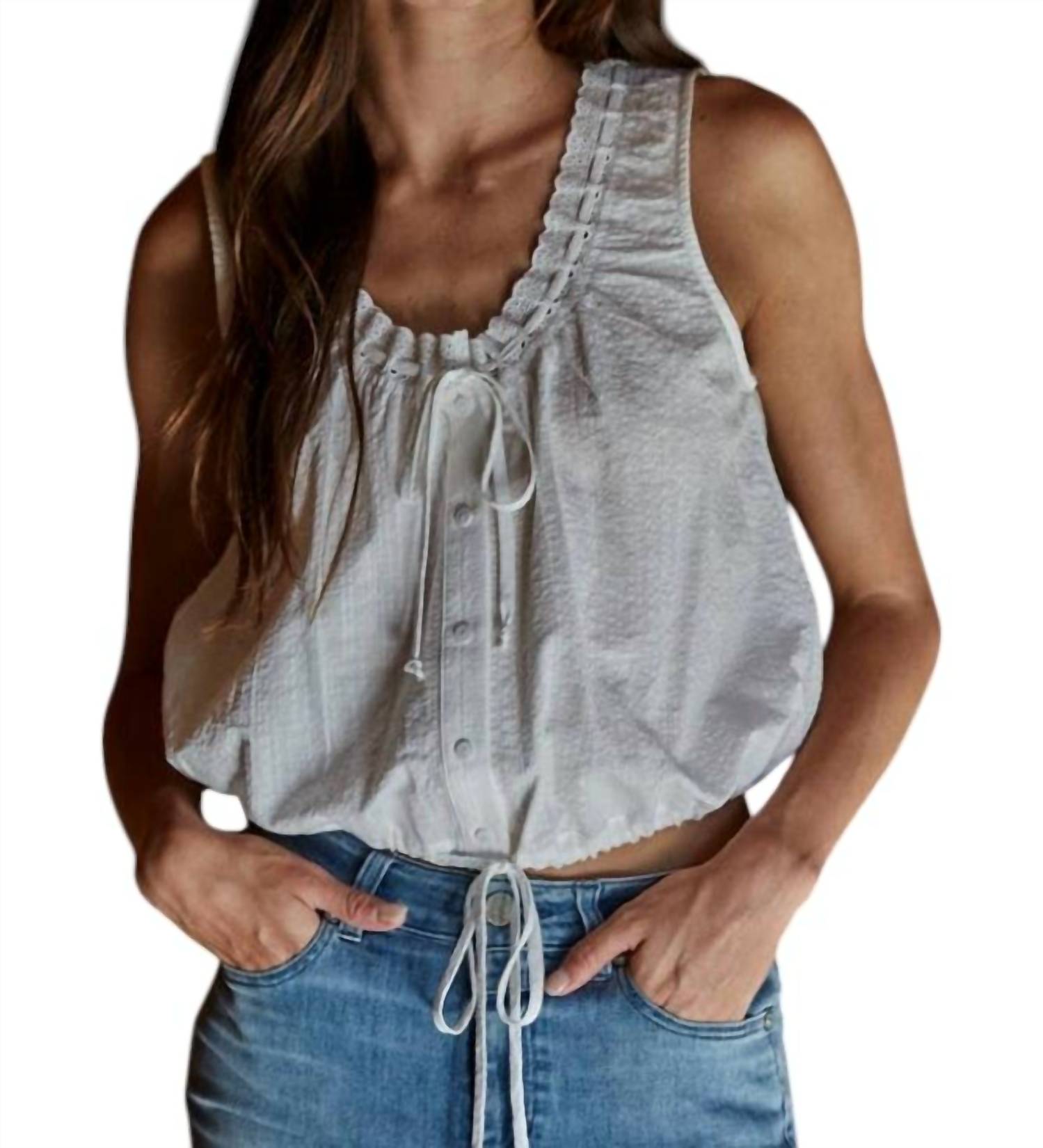 A timeless blouse that will never go out of style. Elevate your vacation style in elegant off white. Women's tank top features a scoop neck and sleeveless design, complemented by a lace trim front and waist tie strap detail. Crafted with woven cotton and rayon, offers a smooth, solid pattern look. Button closure. Hand wash to maintain its delicate fabric.