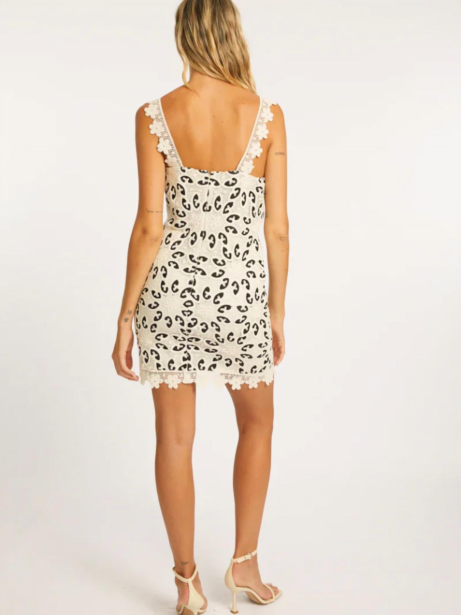The perfect mini dress for those warmer months. Introducing the Manet Mini Dress by CABALLERO, a stunning sleeveless dress perfect for summer occasions with a distinct boho-chic flair. This ivory and black floral lace dress is crafted from 100% cotton, offering style and breathability. Designed in a flattering bodycon silhouette, it features a square neckline, flower trim at the hem, and a convenient back zip closure. Ideal for vacation or dressier outings, it is machine washable for ease of care.