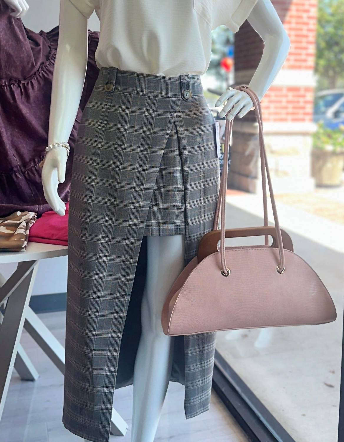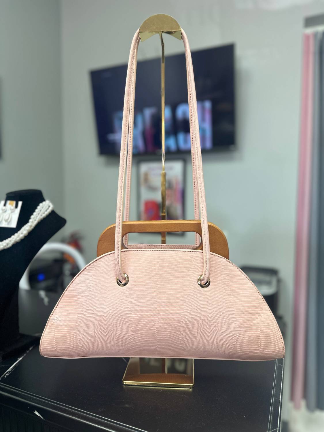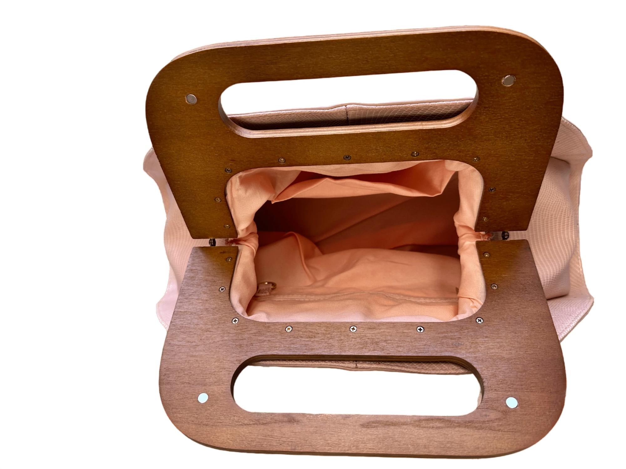 The Women's Lizard Print Boxy Tote Bag by Calin Collection offers a sleek, structured design in elegant light pink. Crafted from lizard print faux leather, this chic tote features a bold texture complemented by a rich wooden handle and gold-tone hardware. With a roomy boxy silhouette, it offers a practical interior with one zipper pocket and two slip compartments, while the 15" drop strap provides versatile carrying options. Dimensions are 16.4"L x 5"W x 8"H.