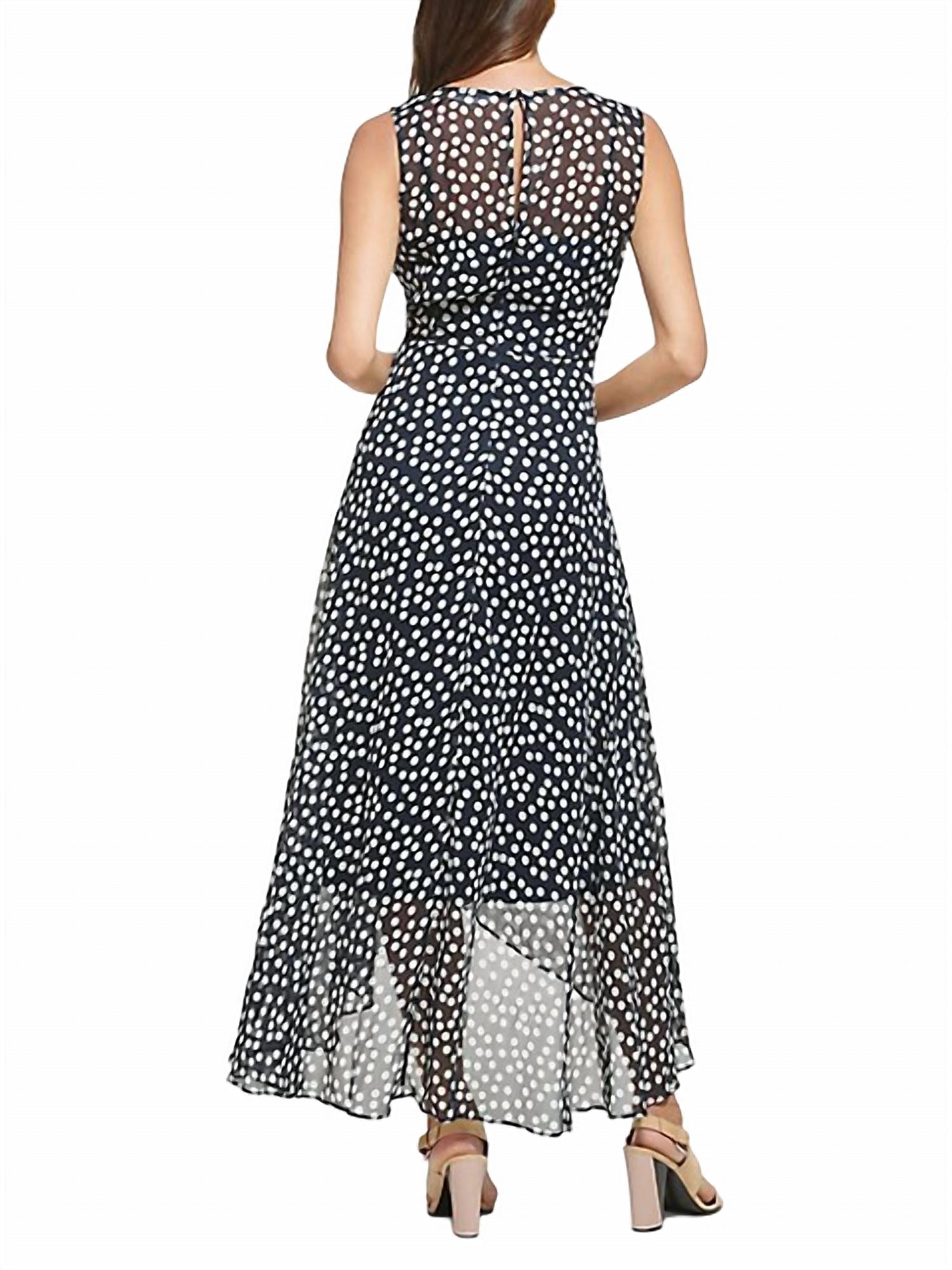 A midi dress so versatile, your options for wearing it are endless. Surplice neckline, sleeveless, concealed back zipper with keyhole and button-and-loop closure, fitted waist, high-low tulip skirt, and liner with adjustable spaghetti straps. Dry clean. 100% Polyester chiffon.