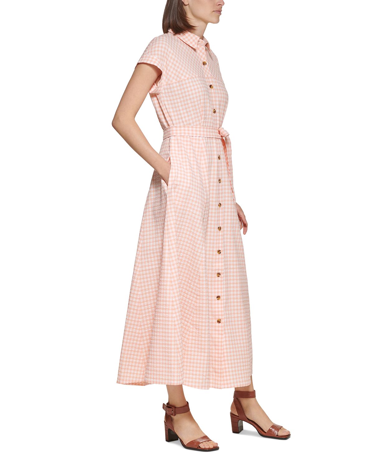 Next-level gingham check is lightly textured and smartly tailored in this belted shirtdress from Calvin Klein.| Approx. 52 long from center back neck to hem. Length is based on size 6 and varies 1/4 between sizes| Falls below the knee to lower calf| Point collar; Shirtdress midi silhouette| Button front closures| Dolman short sleeves with cuffs| Tie belt at waist