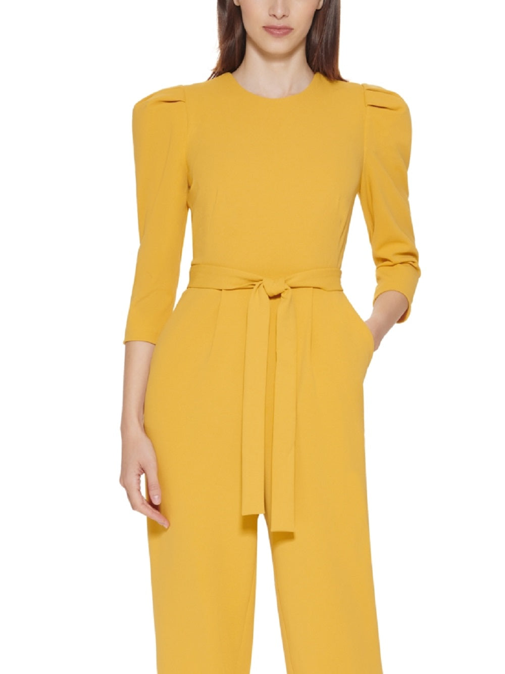 A belt defines the waistline of this chic jumpsuit from Calvin Klein| a 3/4-sleeve pick designed with puff shoulders.| Crewneck; back zipper closure; ties at waist| 3/4-sleeves| Imported| Two inseam pockets| Pleated and puffed at shoulders