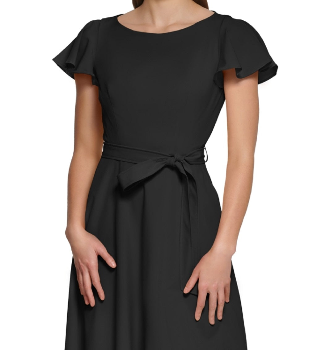 Fluttery sleeves lend endless charm to this timeless fit & flare dress from Calvin Klein| complete with a matching tie at the waist.| Approx. 38-1/2 long from center back neck to hem. Length is based on size 6 and varies 1/4 between sizes| Fitted through the chest and waist; structured A-line skirt sits slightly over hips| Boat neckline; A-line silhouette| Back zipper closure| Short flutter sleeves