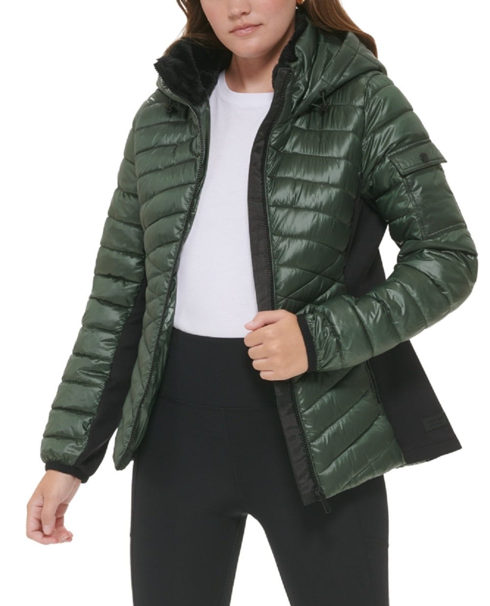 Calvin Klein Women's Hooded Mixed Media Puffer Jacket Green Size Medium