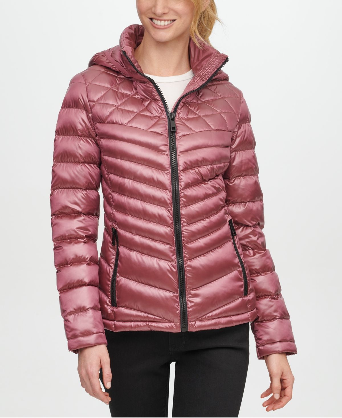 A shimmery finish elevates this stylish puffer coat from Calvin Klein| a packable pick designed with a cozy hood