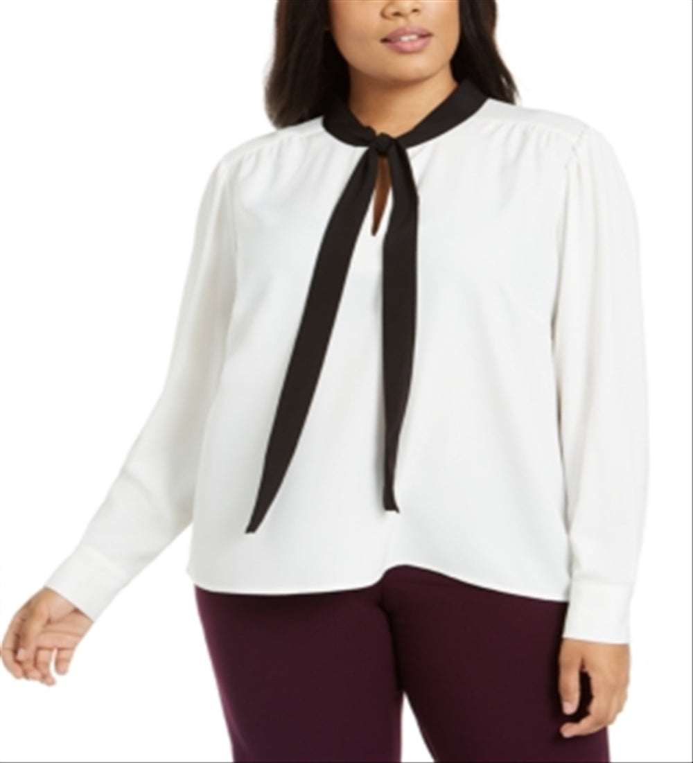 Calvin Klein Women's Long Sleeve Tie Neck Wear to Work Top Plus White Size 3X