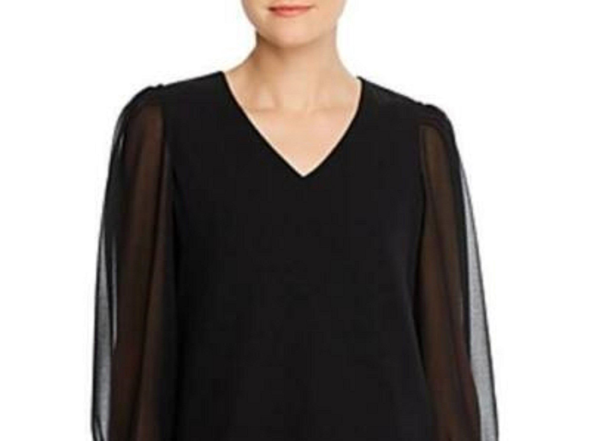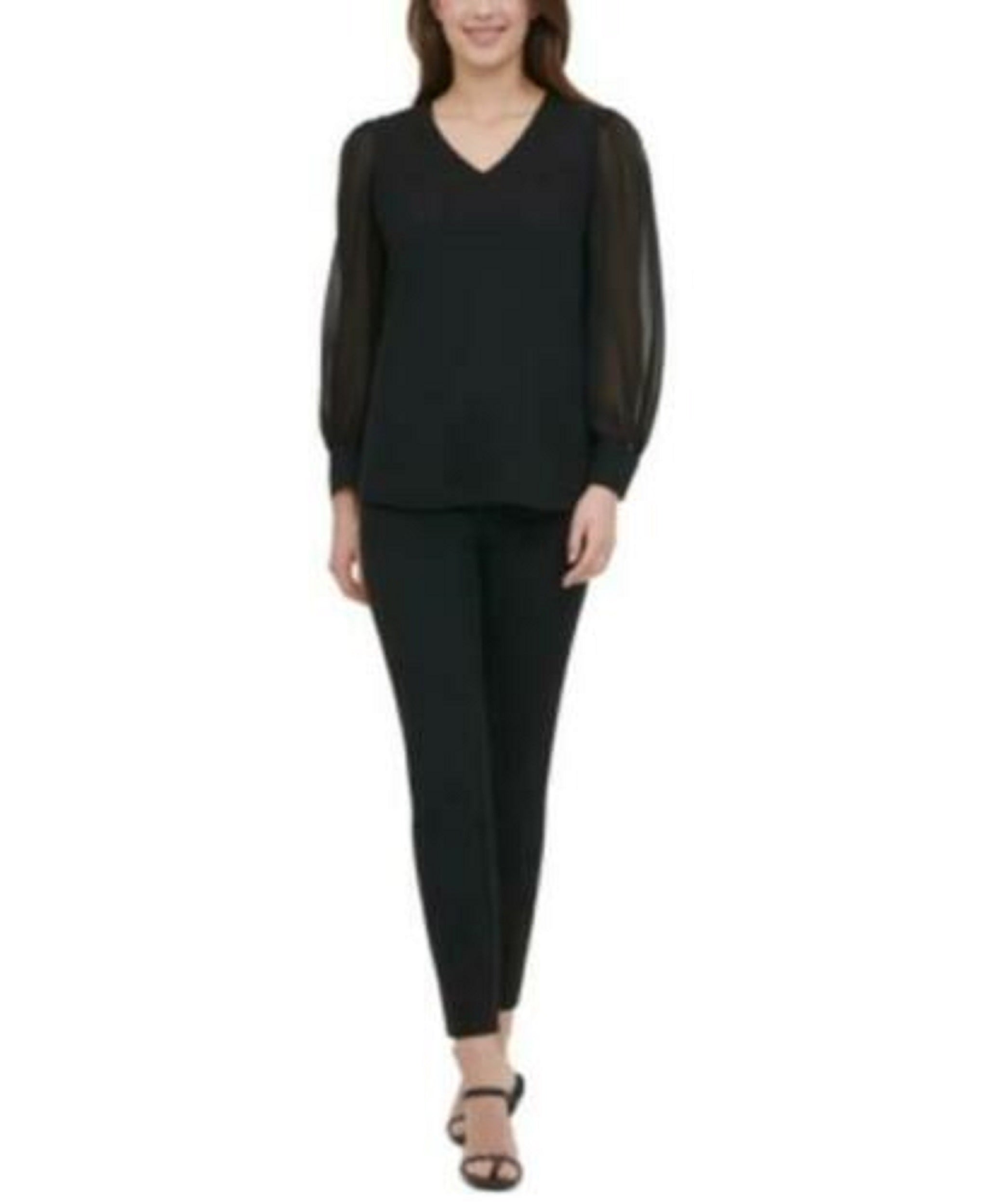 Approx. inseam: 32-1/2"|V-neck|Sheer blouson sleeves|Polyester|Machine washable|Imported