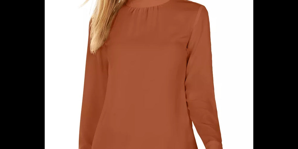 Mock neckline; keyhole & button closure at back neck|Pleated details at front neckline|Long sleeves with buttoned cuffs|Polyester/spandex|Dry clean