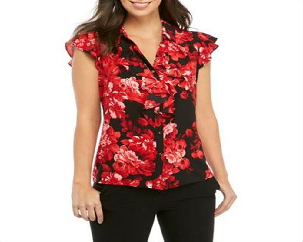 Calvin Klein Women's Multi Short Cap Sleeve Floral Blouse Red Size X-Lage