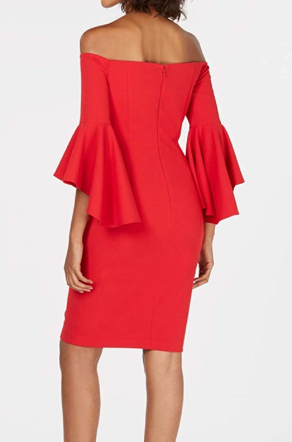 Designed to fit and flatter 5'4" and under frame|Off-the-shoulder neckline; Sheath silhouette|Hidden back zipper with hook-and-eye closure|Ruffled 3/4-sleeves|Boning at bust|Shell, lining: polyester|Dry clean