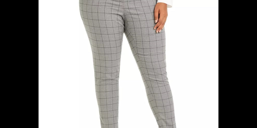 Calvin Klein Women's Plus Size Belted Windowpane-Print Slim-Leg Pants Gray Size 24W