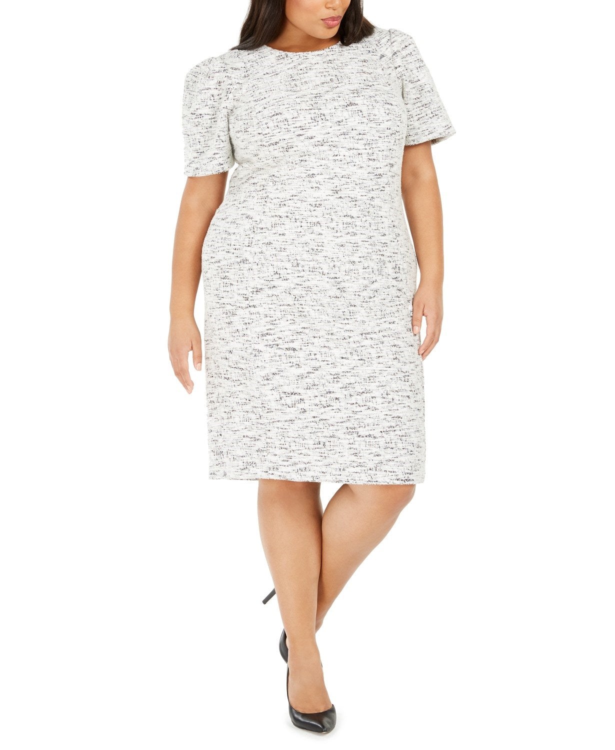 Approx. model height is 5'10" and she is wearing a size 14W|Approx. 39-3/4" long from center back neck to hem and varies 1/4" between sizes|Scoop neckline; Sheath silhouette|Exposed zipper at center back|Puff pleats at shoulders|Unlined