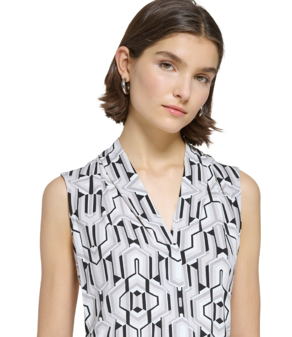 A gorgeous geometric print covers every inch of this sleeveless career top from Calvin Klein. A V-neck gives the look a classic finish.| V-neck| Imported| | Materials & Care| | Polyester