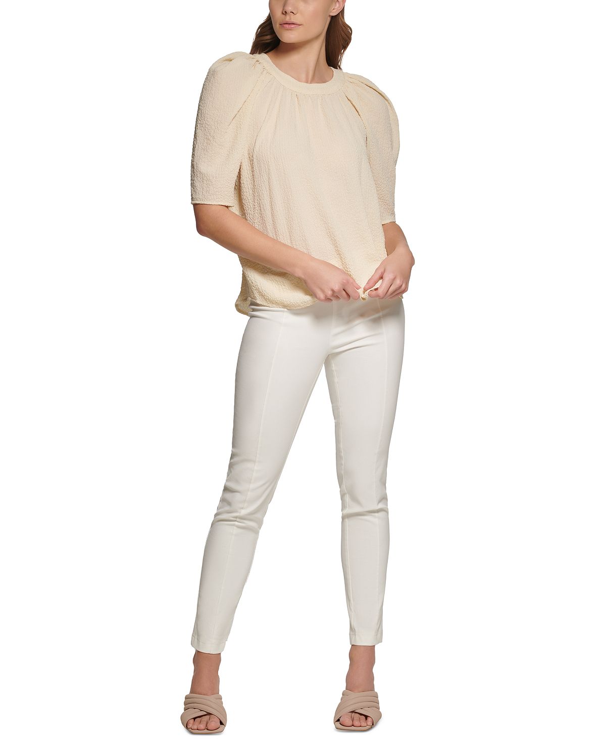 Add a stylish piece to your closet this season with Calvin Klein's textured puff shoulder blouse.| Approx. 23 long| Back button closure| Polyester/spandex| Machine washable| Imported