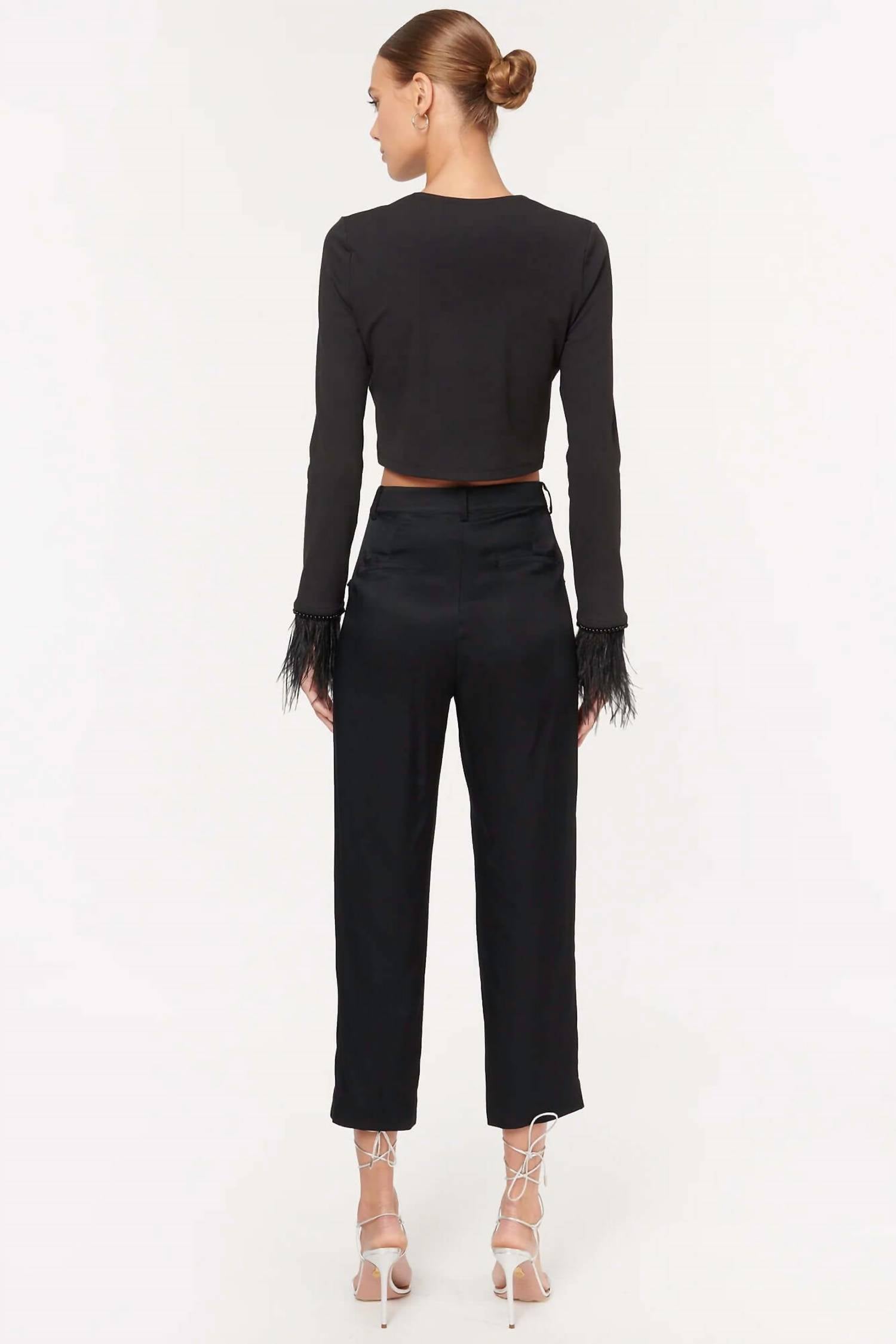 Upgrade your wardrobe with these cropped pants, designed to merge sophistication and wearability. The tailored fit ensures ultimate comfort during long days or nights out. Introducing the Jill Pant by Cami NYC, a sophisticated high-waisted trouser in classic black with a tapered leg style. Crafted from a luxurious blend of 67% Viscose and 33% Rayon, this piece adds an elevated touch with black bead trims at the pocket edges. The pant features a comfortable zip closure, flat waistband, and is accentuated by princess seams and back welt pockets. Care for this refined style with dry cleaning, making it an ideal choice for workwear or dinner parties.