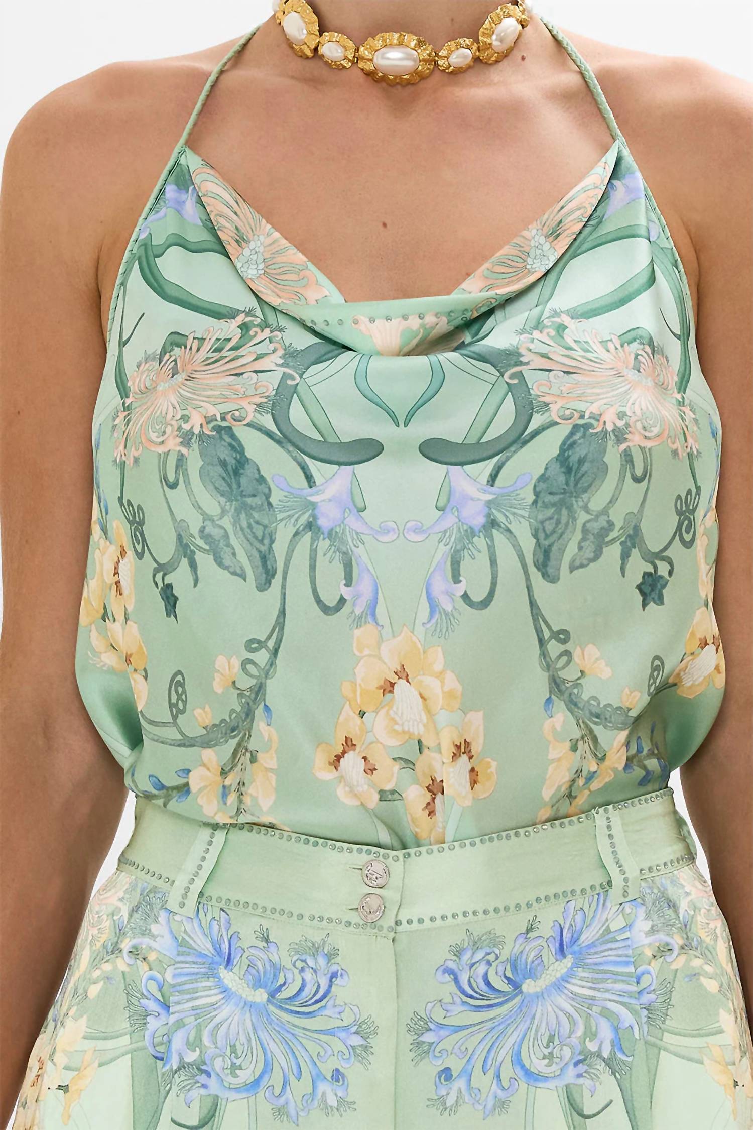 A timeless blouse that will never go out of style. Introducing the Bias Halter Top by Camilla, a luxurious piece in the enchanting Dreaming in Dutch design, adorned with art nouveau swirls and painterly blooms. This sleeveless top features a cowl neck and low scooped back, offering a captivating allure with adjustable straps and custom tassels. Crafted from 100% silk, it exudes a rich buttery touch, ideal for spring holiday parties. Closure: Pull on. Care: Dry clean only. Model wears CAMILLA S, standing at 5'10" with measurements 32" bust, 35" hips, and 25" waist.