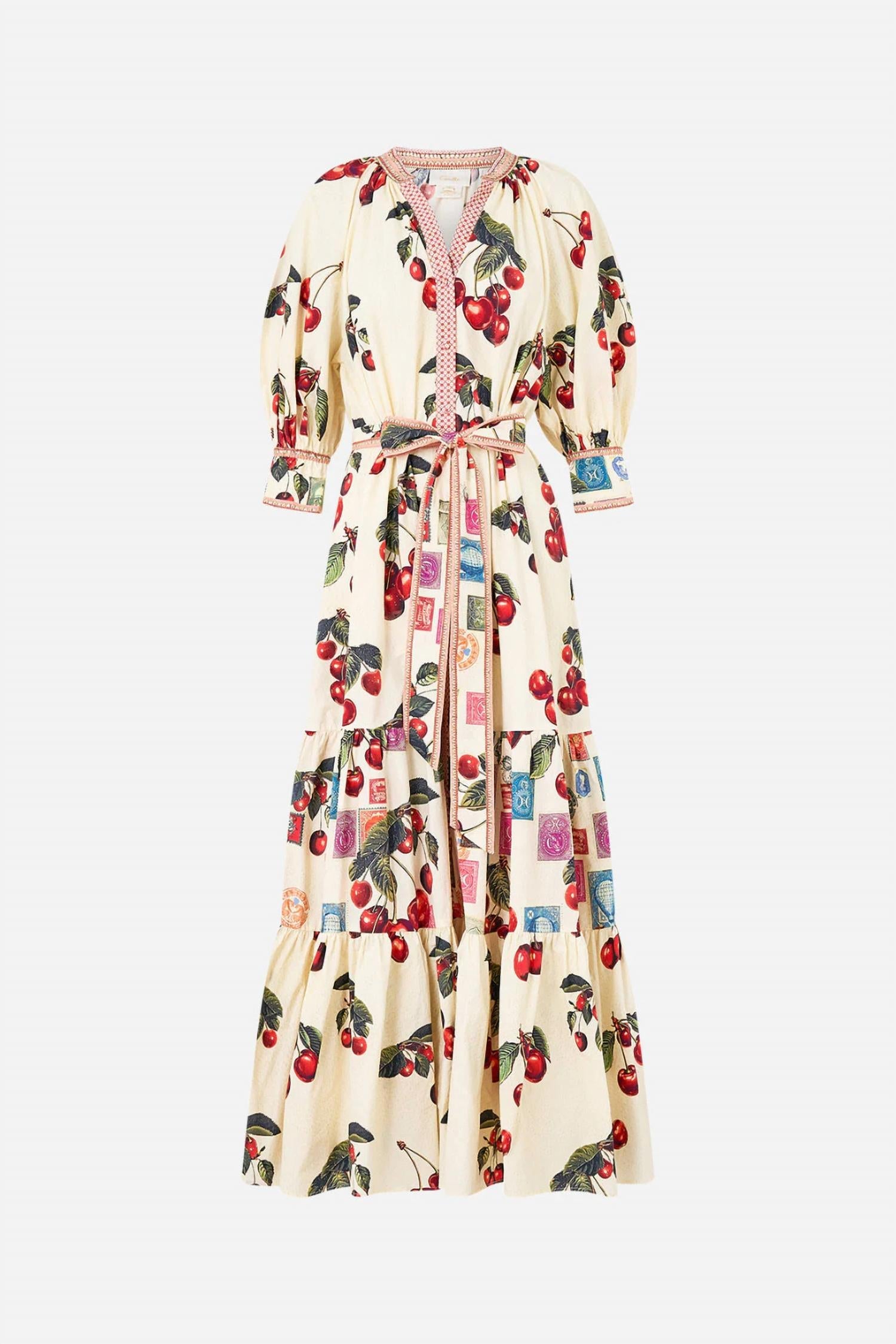 A maxi dress that is just as cute as it is comfortable. Introducing the Women's Tiered Shirt Dress by Camilla, a captivating Boho Chic piece in the exclusive "Notes From The Road" print. This full-length maxi dress is crafted from 100% Organic Cotton, featuring short blouson sleeves, a V-neckline, and a flattering button-through front. The dress is beautifully patterned with a tie closure, adding an artistic flair to your summer vacation wardrobe. Care instructions: Machine wash.