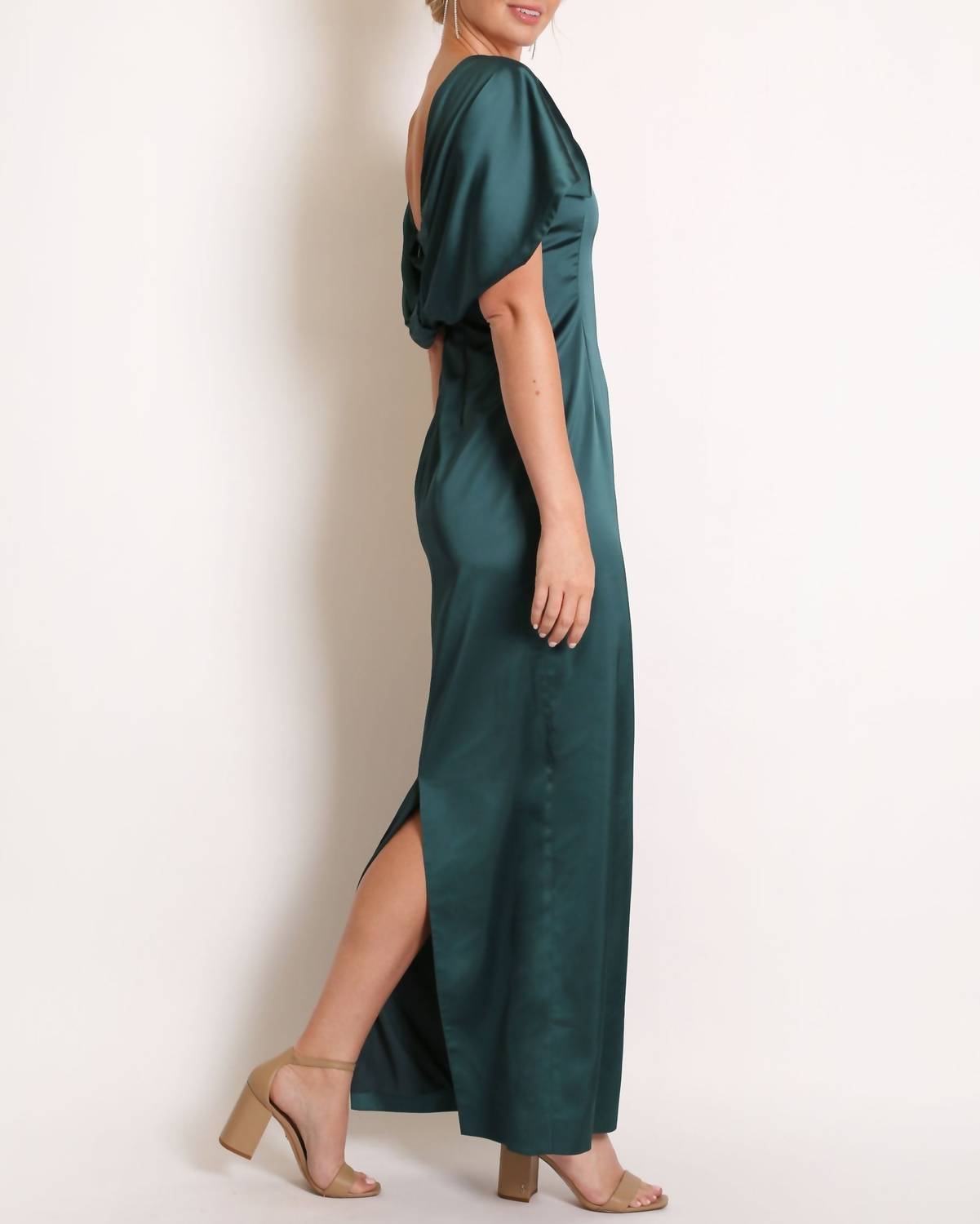Style this maxi with your favorite statement necklace and sandals for the perfect look. Step into understated elegance with the Flora Gown by Camilyn Beth, a stunning choice in teal satin for any special occasion. Emphasizing an elegant sheath silhouette and short sleeves, this gown is crafted from luxurious stretch satin or peau de soie and designed in Florida, manufactured in NYC. The dress features a distinctive bow back detail, bra friendly, and an invisible zip closure for a chic and secure fit. Care instructions recommend dry clean only to maintain its exquisite fabric and finish.