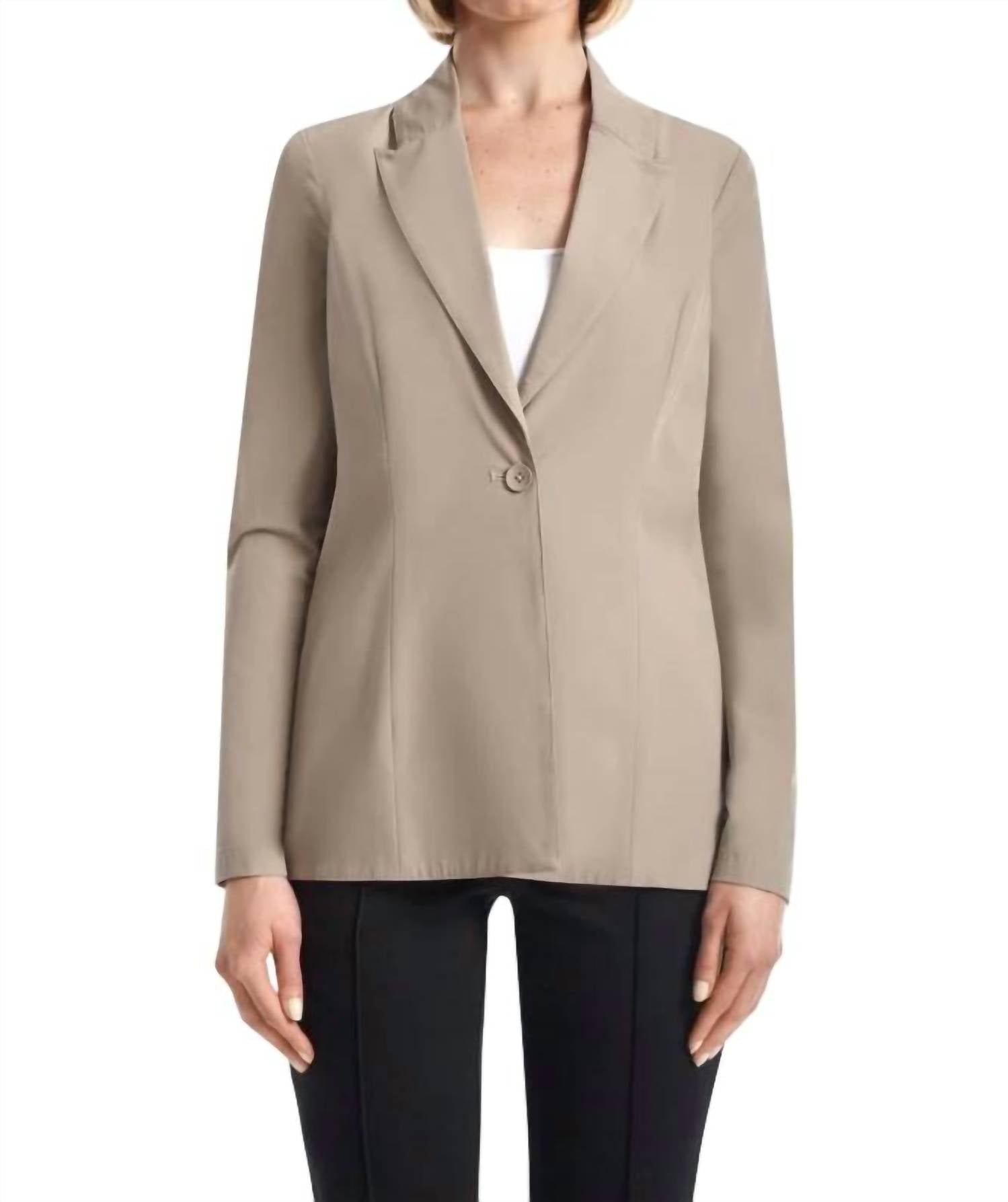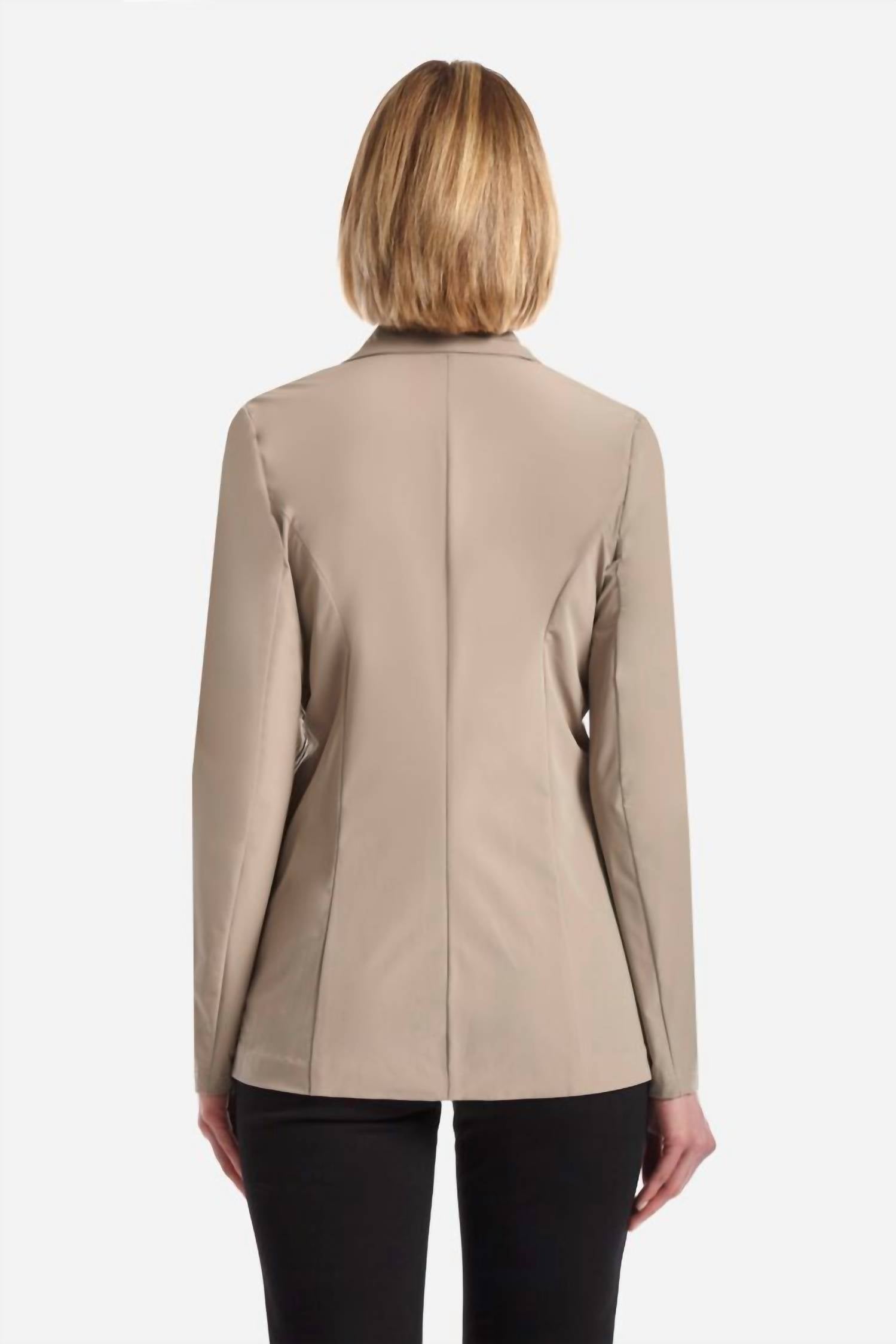 Water resistant parker tech. Side zippers. Polished notch lapels and a buttoned front. Long sleeves. True to size. About 28" from shoulder to hem. Blazer Fit Type - Comfort Fit. Model is 5'11" and wearing a size small. 90% Nylon, 10% Spandex. Machine Wash Cold, Do Not Bleach, Lay Flat To Dry, Cool Iron If Needed, Or Dry Clean. Imported.