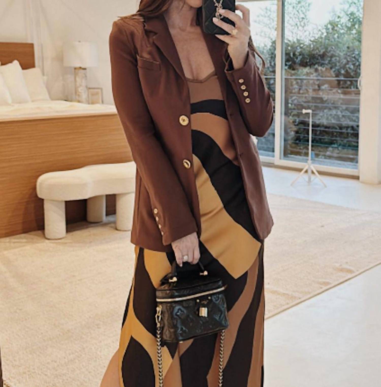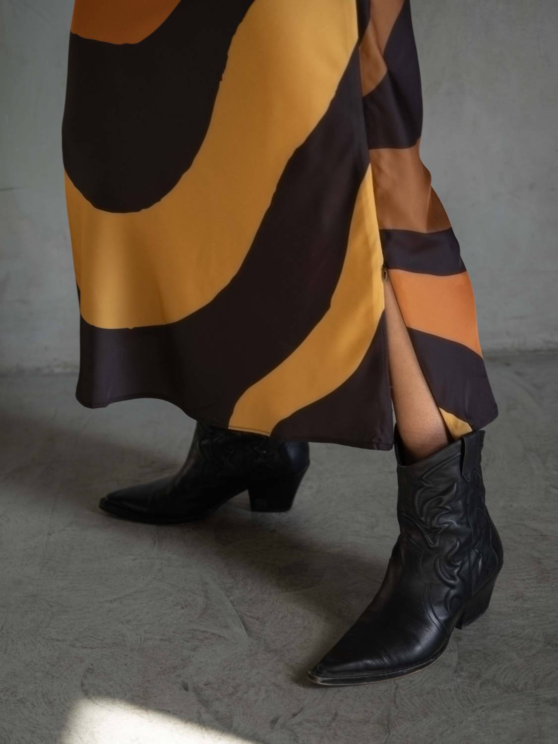 The perfect length dress does exist. Introducing the Lennon Zipslip Dress by Care Tucker, a must-have piece in Brown for any woman's wardrobe. This sleeveless, V-neck midi dress combines comfort and style with its slip silhouette and patterned design, perfect for music festivals or Thanksgiving gatherings. The versatile dress features a unique 65cm slit with a hidden zipper, offering the choice to showcase a little extra flair. Closure: Pull on. Care: Machine wash.