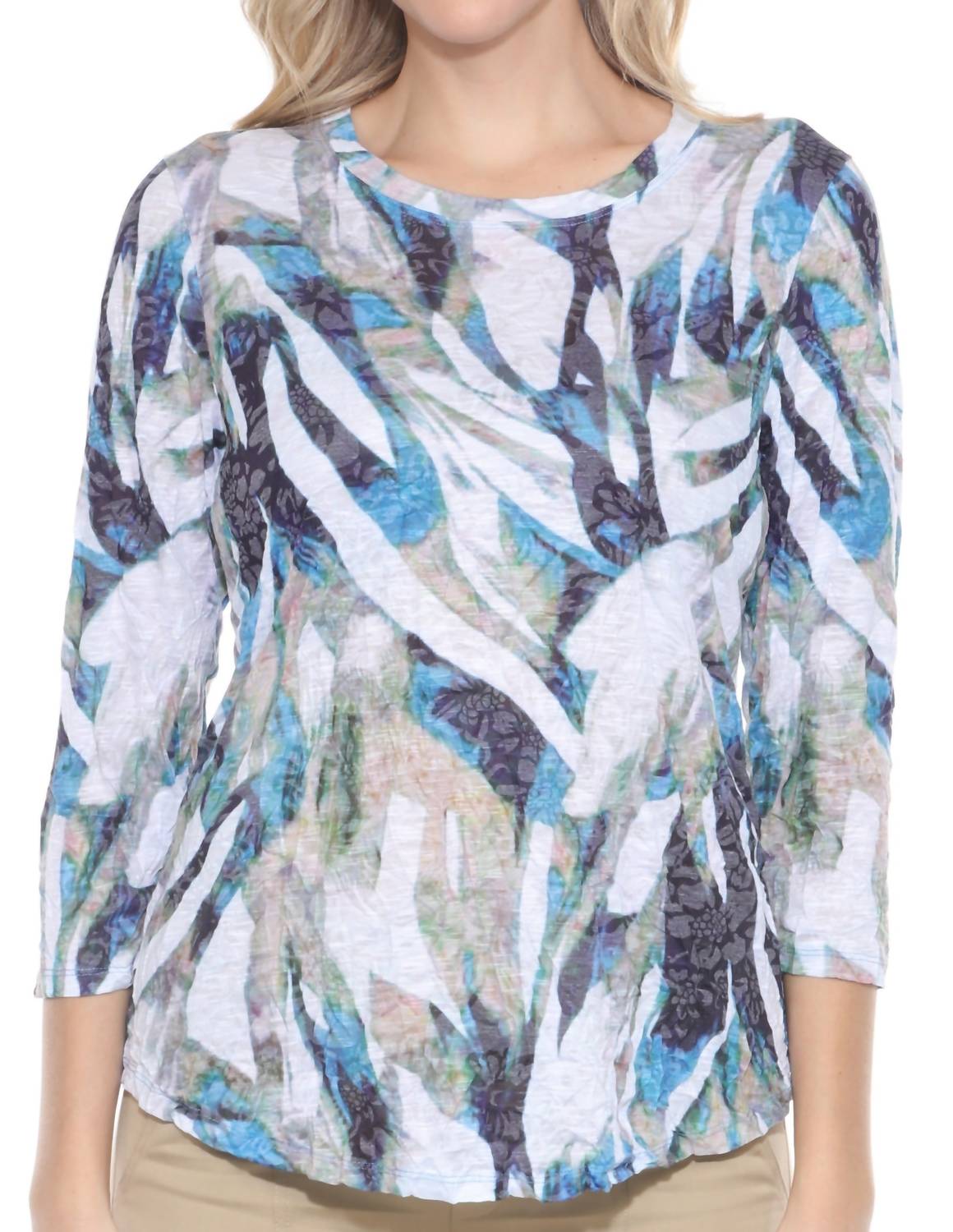 A timeless blouse that will never go out of style. Embrace effortless style with the CARINE Round Neck Top in Crystal Grove, an ideal choice for vacation-ready fashion. Designed with three-quarter sleeves, this patterned top boasts a breathable, lightweight crinkle fabric from laser burnout composed of 35% Rayon and 65% Polyester. Easily pull on this relaxed fit garment, which features a 23.5" regular length and a 36" bust in size Medium, perfect for warm summer days. Care is a breeze with machine wash cold and line dry instructions, making it a travel-friendly staple. Designed by Carine Wang in Scottsdale, Arizona.