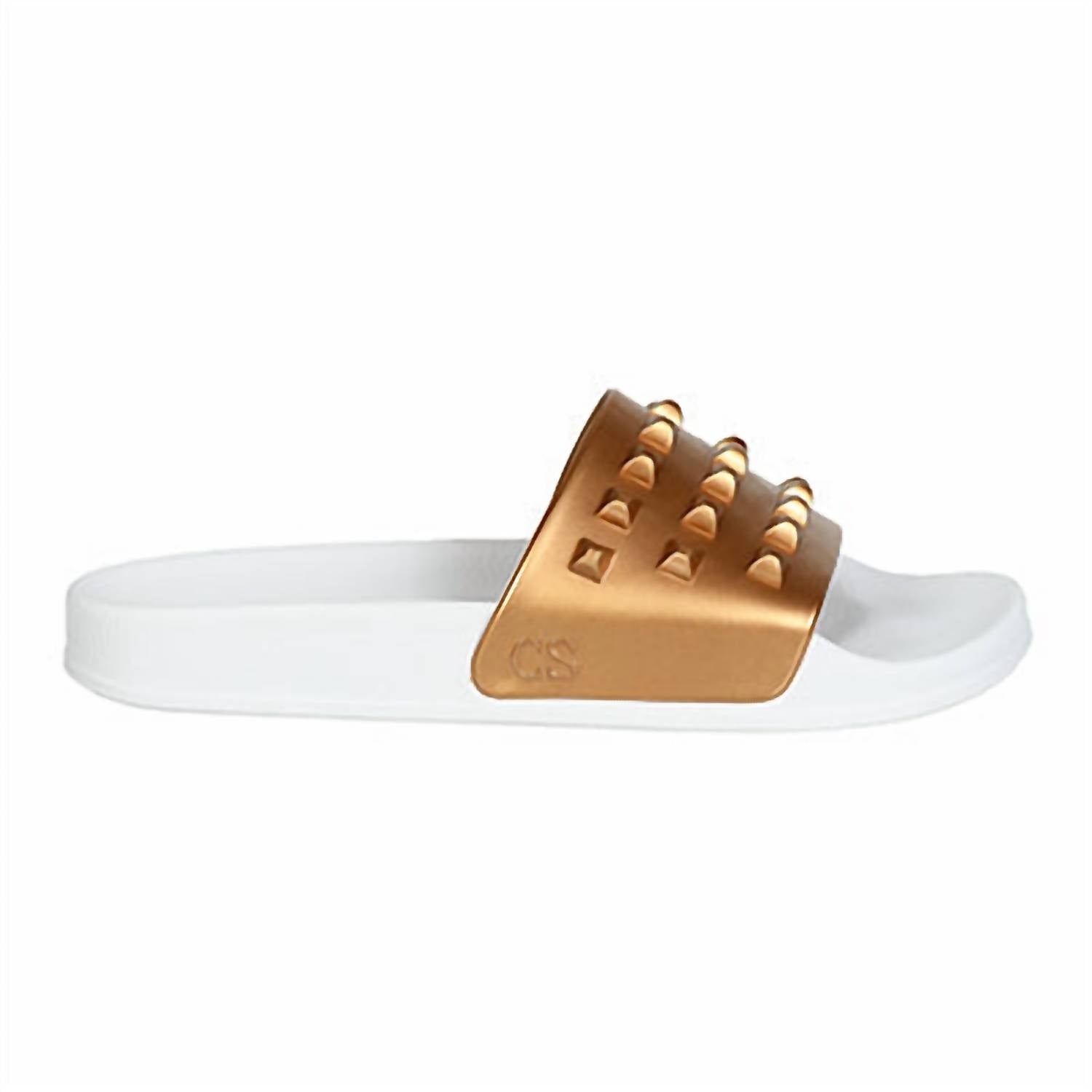 Slip into these, we promise you won't regret it. Elevate your summer style with the Women's Franco Slides by CARMEN SOL, stunning in rose gold and perfect for a vacation look. These Italy-made slides are crafted from sustainable high-quality Italian jelly, featuring a hand-painted metallic treatment and a studded band for a chic streetwear aesthetic. The open toe design and white molded footbed ensure comfort, while the nontoxic PVC material guarantees they are eco-conscious and vegan. Slides tend to run small, so consider sizing up for an optimal fit; they include an eco-conscious dust bag and box for effortless travel.