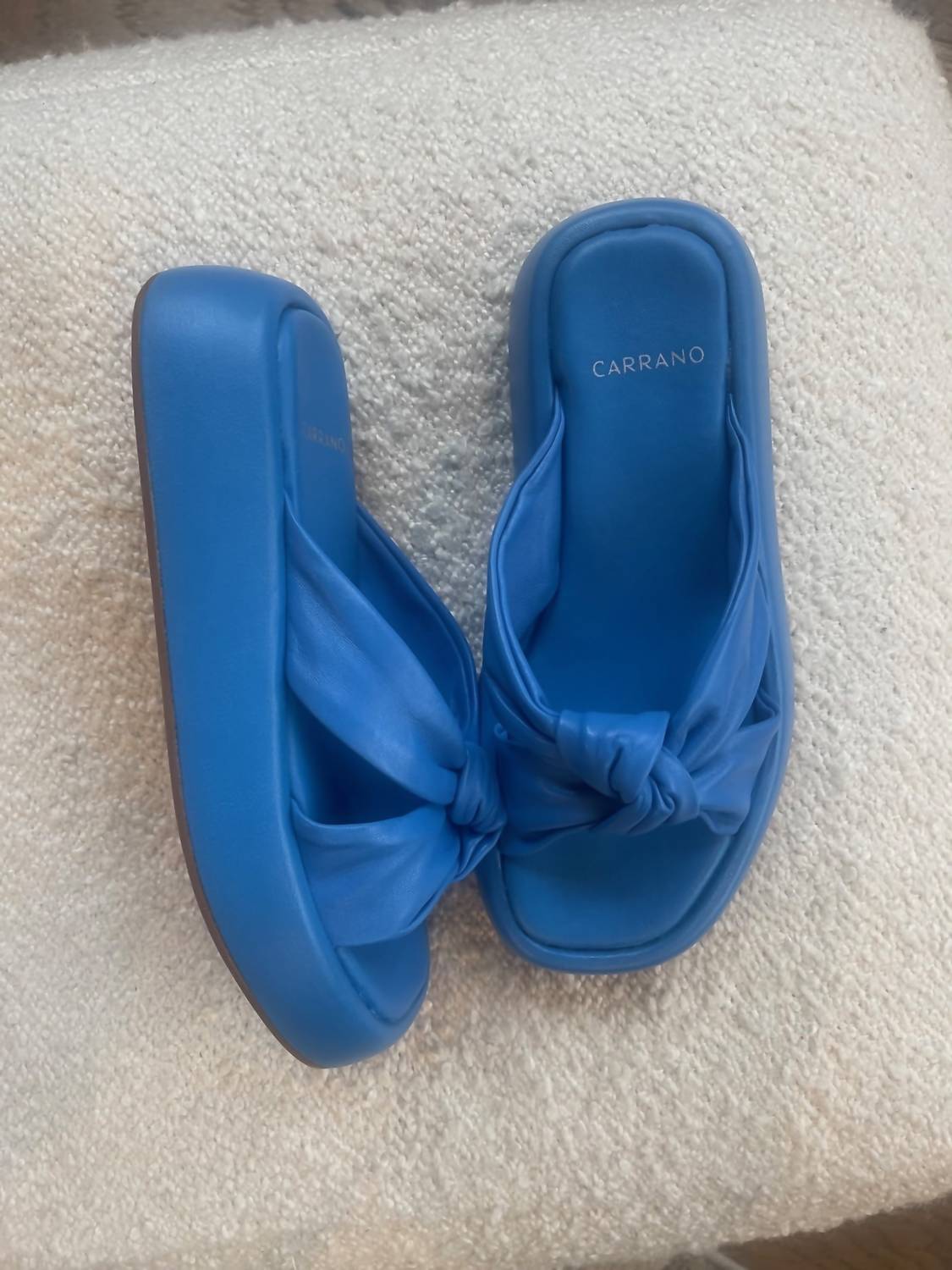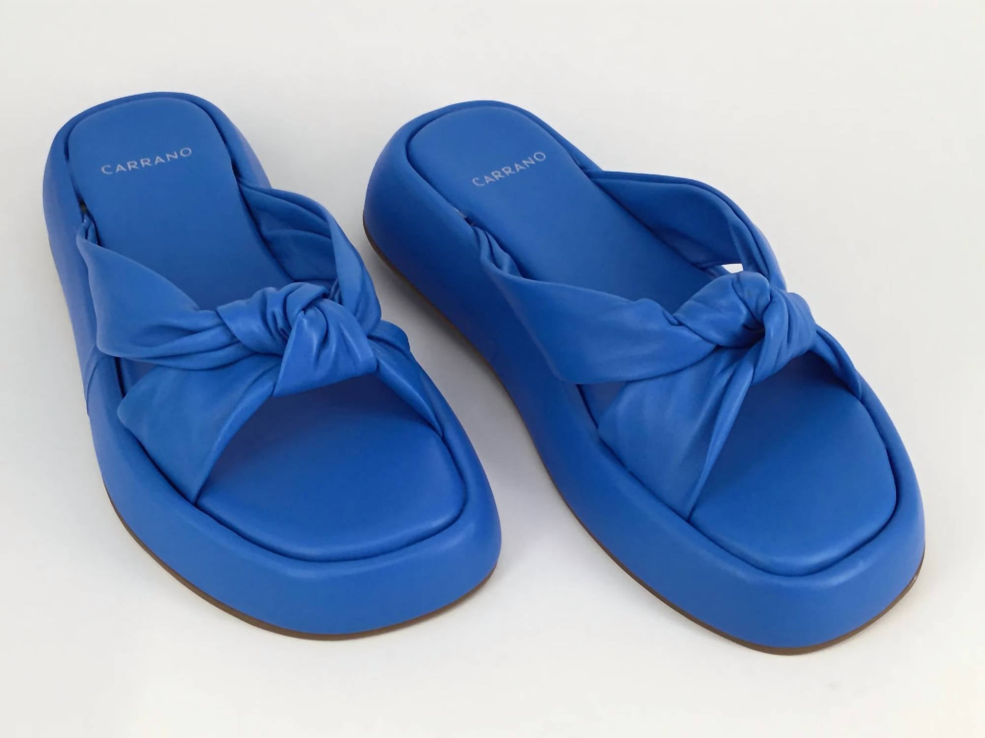 Classicly cute and all-day-wearable. We love this sandal. Enhance your summer wardrobe with the Women's Anaya Flatform Sandal by Carrano, a minimalist pick perfect for vacation and Mother's Day celebrations. Crafted from Brazil, this sandal showcases super soft leather uppers in a stylish knot detail, beautifully crossing over the foot with a splayed sole and cushioned footbed for superior comfort. Featuring a blue hue, it offers a round toe design and wedge heel, capturing an effortlessly chic aesthetic.