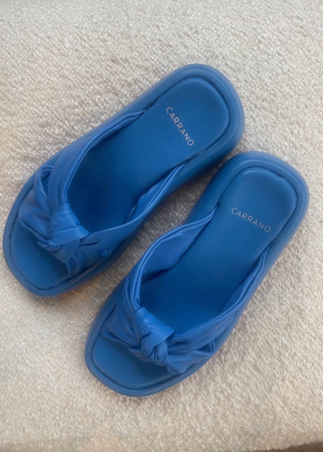 Enhance your summer wardrobe with the Women's Anaya Flatform Sandal by Carrano, a minimalist pick perfect for vacation and Mother's Day celebrations. Crafted from Brazil, this sandal showcases super soft leather uppers in a stylish knot detail, beautifully crossing over the foot with a splayed sole and cushioned footbed for superior comfort. Featuring a blue hue, it offers a round toe design and wedge heel, capturing an effortlessly chic aesthetic.