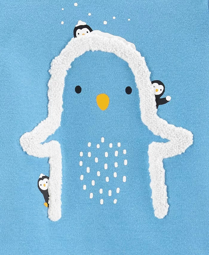 Bodysuit: ribbed at neckline and cuffs, snaps at bottom, fleece penguin motif at front|Pants: covered elastic waistband, faux drawstring. ribbed cuffs|Bodysuit, pants: cotton; trim: polyester sherpa fleece|Machine washable|Imported