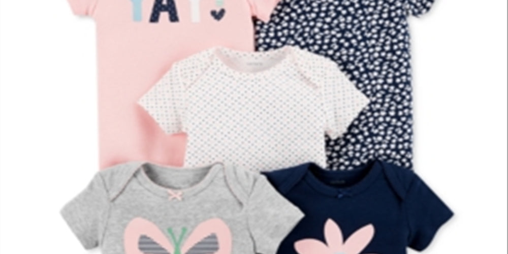 An essential part of baby's wardrobe| this five-pack of soft short-sleeve cotton bodysuits arrives in an array of prints and provides a comfortable base layer that's perfect for pairing with pants or shorts or even wearing under her favorite outfits.| Five pack | Assorted prints| Crew neck | Lap shoulders| Snaps at bottom