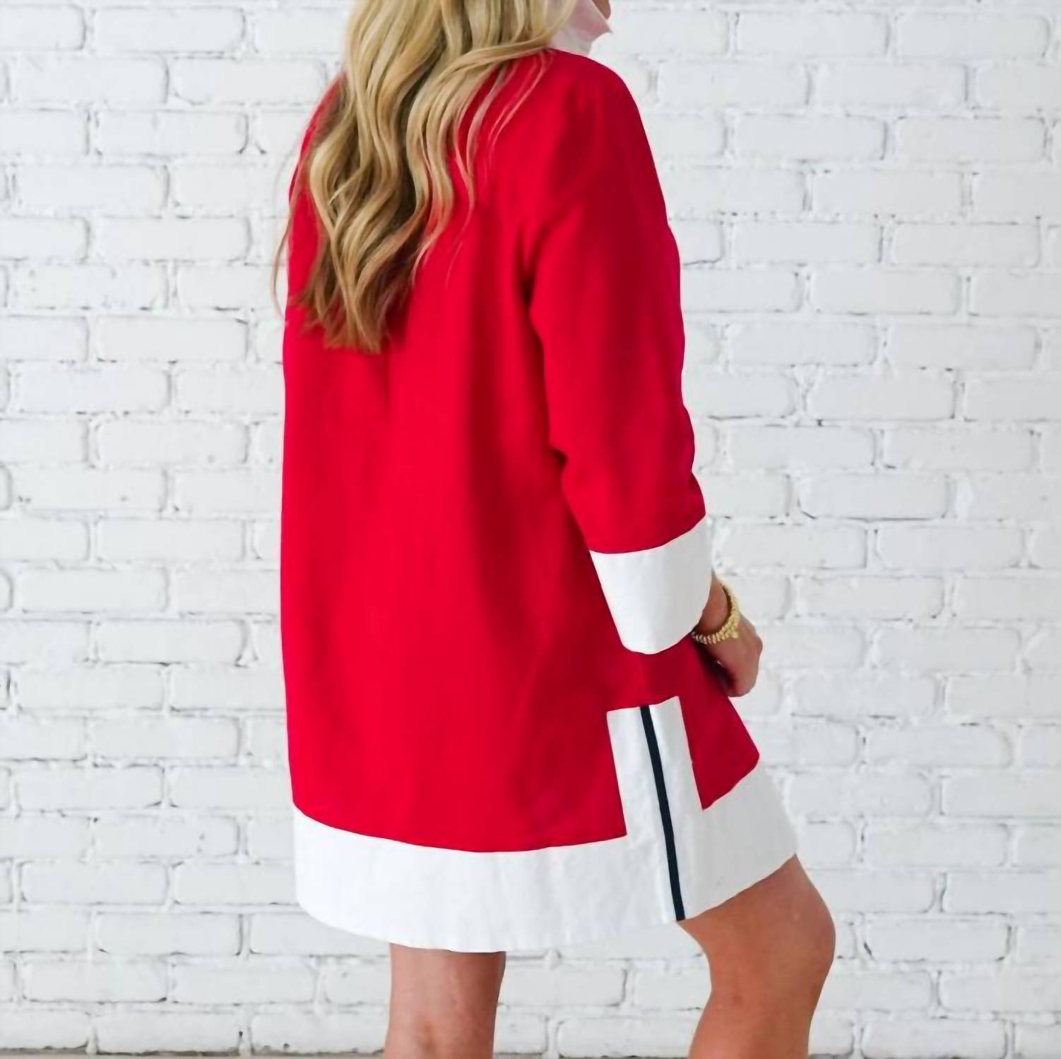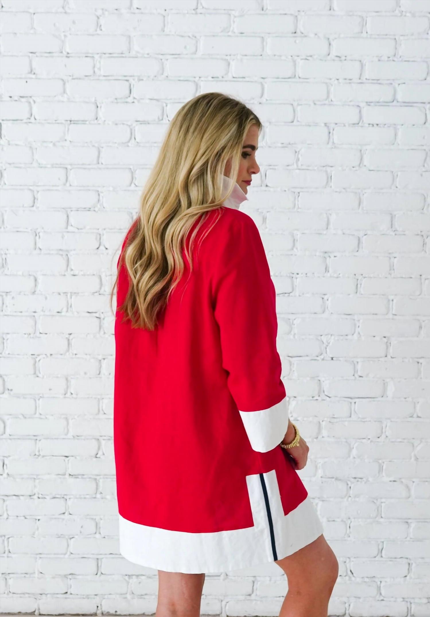 Discover the Caryn Lawn Carrie Dress, a caftan-style shirt dress perfect for your spring wardrobe. With long sleeves and an elegant collar neckline, this dress features striking red detailing on the sides, adding a touch of sophistication. The solid pattern and button closure combine for a classic, polished look, while pockets add practical charm. Ideal for a holiday party, this dress is crafted without specific care instructions provided.