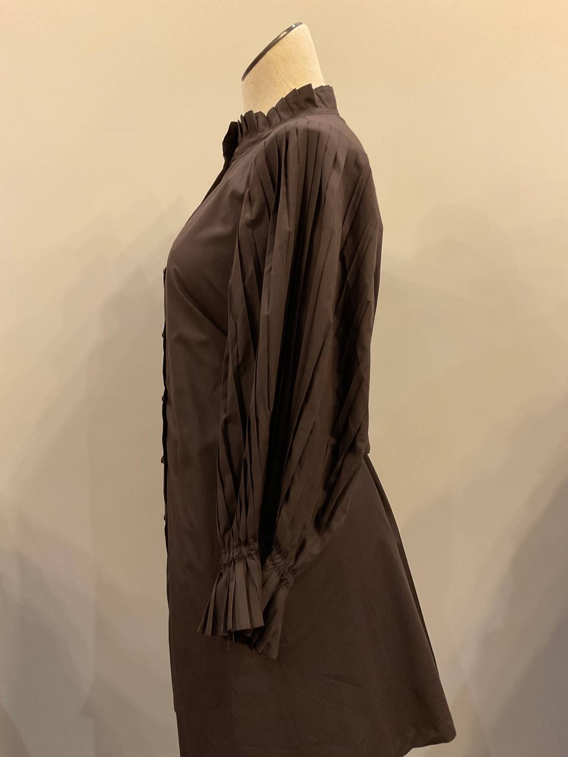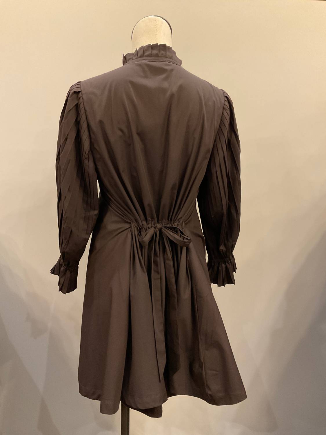 The perfect mini dress for those warmer months. Introducing the Women's Molly Mini Dress by Caryn Lawn, a charming addition to any wardrobe. This shirt dress features long pleated sleeves and a functional bow at the back for a playful touch. The solid brown hue and button closure enhance its versatility, making it perfect for spring engagements and workwear trends. With a classic collar neckline and a stylish silhouette, this dress is your go-to piece for Thanksgiving gatherings.