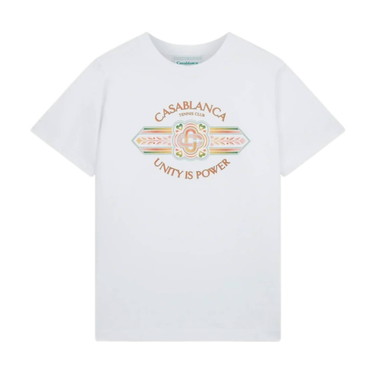 Introducing the Casablanca Unity Is Power Graphic T-shirt, a short-sleeve design in crisp white with a powerful message at its core. Crafted from 100% organic cotton, this t-shirt features a comfortable unisex fit and a classic crewneck for a timeless look. Made in Portugal, it offers effortless style with a pull-on closure, ideal for summer music festivals. Care for it with a delicate machine wash to keep it in pristine condition. Model is 186acm/6'1" and wears a size M.